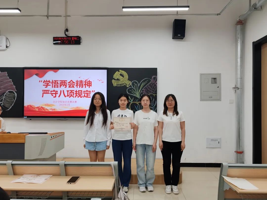 为深入学习贯彻两会精神和习近平总书记关于深入贯彻中央八项规定精神学习教育的重要讲话和重要指示精神,展现新时代会计学院学子的昂扬风采与奋进姿态,2025年5月27日,会计学院“学悟两会精神 严守八项规定”知识竞赛决赛在K3-112举行。 活动现场 首先由会计学院党总支组织委员王冬月老师进行赛前动员。决赛现场气氛紧张而热烈,各参赛队伍在必答题、抢答题、选答题等多个环节中展开激烈角逐。选手们思维敏捷、对答如流。经过激烈比拼,最终聚智谋远队荣获一等奖,清风先锋队荣获二等奖,学悟两会队和学规先锋队荣获三等奖,聚智谋远队荣获最佳人气奖。 此次知识竞赛让会计学院学子更加深入地学习了两会精神和中央八项规定精神,同学们纷纷表示,在今后的学习和生活中,会以两会精神和中央八项规定精神为指引,明确时代赋予的责任与使命,积极关注国家发展动态,将个人成长与国家需求紧密相连,努力提升专业素养,坚持务实高效的作风。会计学院将以此次活动为抓手,扎实筑牢学生爱党爱国的思想根基,促成“以赛助学、以学促行”的优良学习风尚。 文/会计学院党务助理团