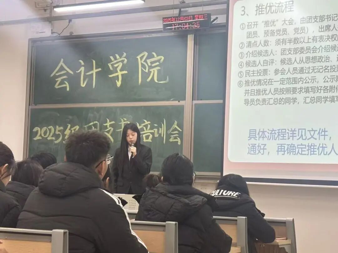 为进一步加强25级团支书队伍建设,提升其业务能力与履职意识,2025年12月3日,会计学院团总支组织部于K2楼114教室组织开展了25级团支书培训会。本次培训以“班干基础工作培训”为主题,围绕团务工作的核心内容系统展开,旨在凝聚25级团支书力量,明确职责使命,为新学期团务工作的顺利推进提供有力支撑。 培训会现场 此次培训共涵盖五大模块:团内推优程序与要求、智慧团建系统操作、团员教育评议流程、密码重置及团组织关系转接审批。培训内容系统覆盖团支书基础工作,明确了团内推优的基本条件与规范流程,包括召开支部大会、组织投票公示及材料填报要求;详细讲解了智慧团建系统的团课录入、教育评议、密码重置与组织关系转接等实操步骤;说明了团员教育评议的开展方式与结果运用;规范了密码重置与团关系转接的办理权限与审核职责;并统一了材料提交的命名规则与报送流程,确保各项工作有章可循、有序落实。在智慧团建系统操作讲解环节,主讲人通过现场投屏,逐步演示了团课录入、教育评议、密码管理及组织关系审批等功能的操作路径与注意事项,尤其对常见错误和易忽略环节作了重点提示,帮助团支书直观掌握信息化工具的使用要领,从而提升日常工作的效率与规范性。 郑佳怡同学发言 会计学院团总支组织部部长郑佳怡在培训总结中提出,团支书不仅是班级团支部的负责人,更是连接上级团组织与广大团员青年的关键纽带,肩负着传达精神、落实工作、服务同学的重要使命。培训会最后向团支书们提出几点要求:要主动关注通知动态,认真审核各类材料,积极配合学院整体工作部署,以高度的责任心确保各项任务按时、保质完成。为建立长效沟通机制,会议现场公布了组织部主要成员的联系方式,便于后续工作中进行实时咨询与定向指导。 团支书培训会现场 本次培训系统地梳理了团支书基础工作的关键环节与操作规范,通过理论讲解与实操演示相结合的方式,有效强化了新任团支书的责任意识与业务能力,为其尽快进入角色、高效开展支部工作奠定了坚实基础。未来,会计学院团总支将继续关注25级团支书成长,助力学院团学发展和青年思想成长。 文/会计学院团总支 审核/数会2504 白馨怡