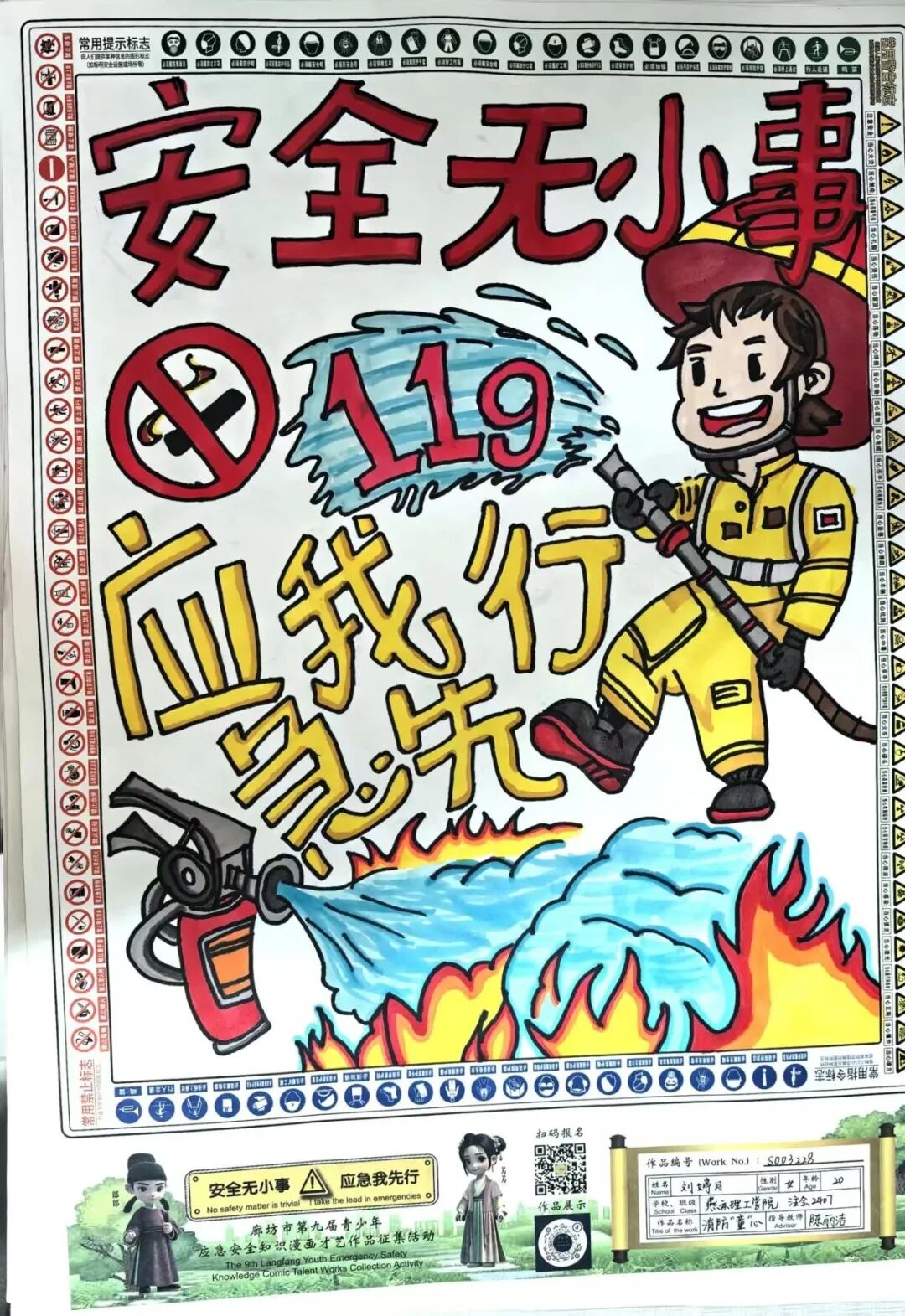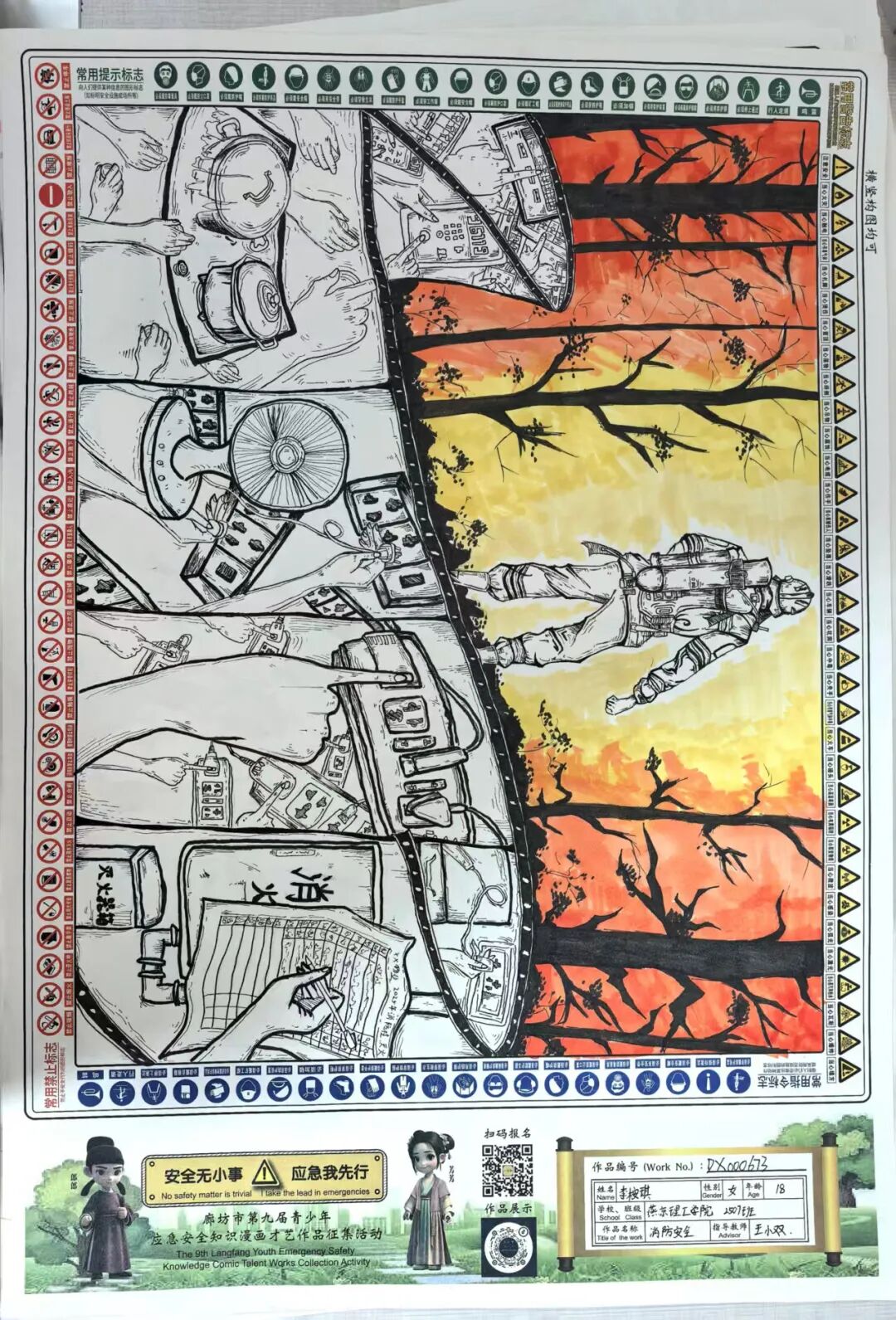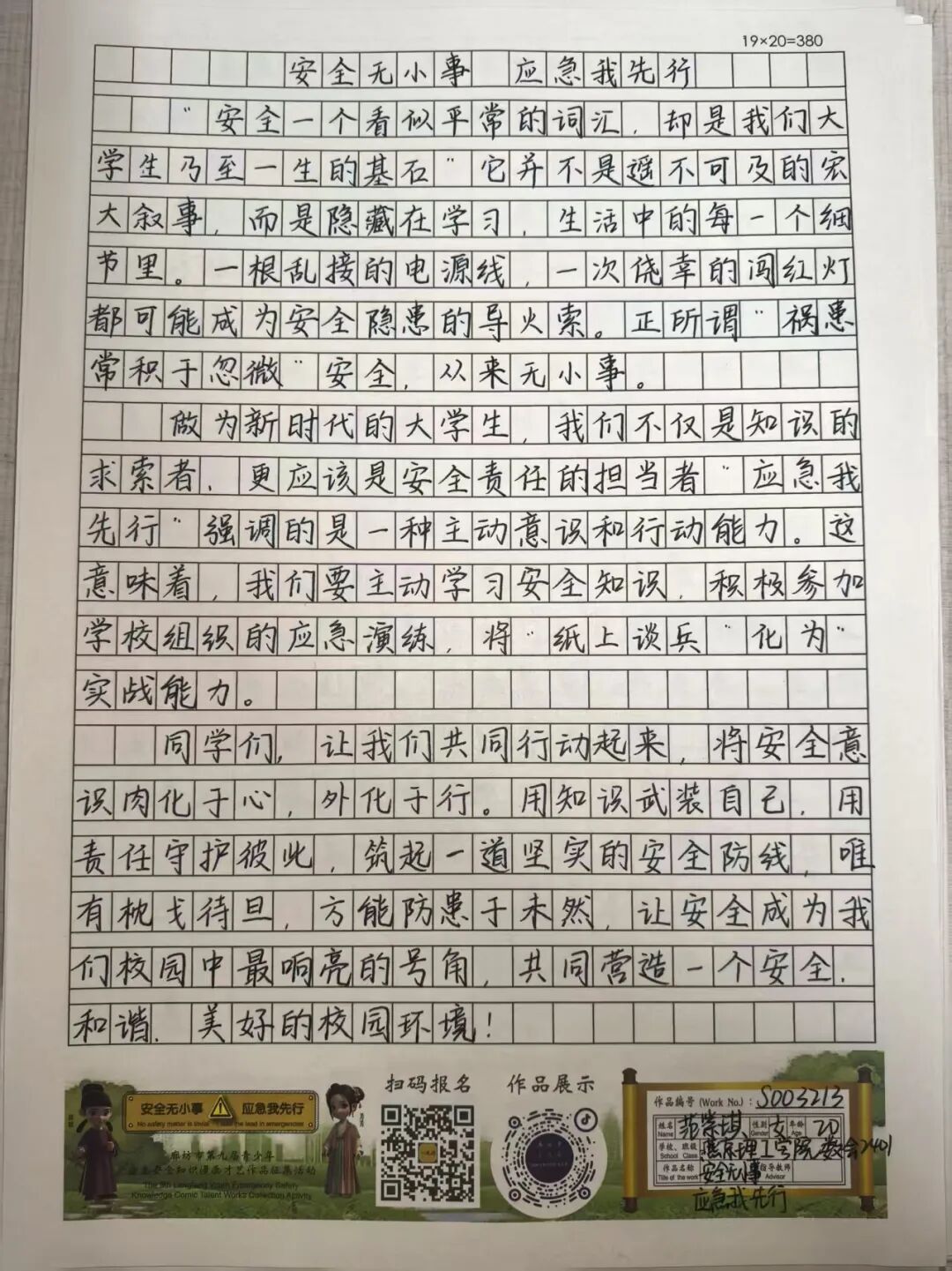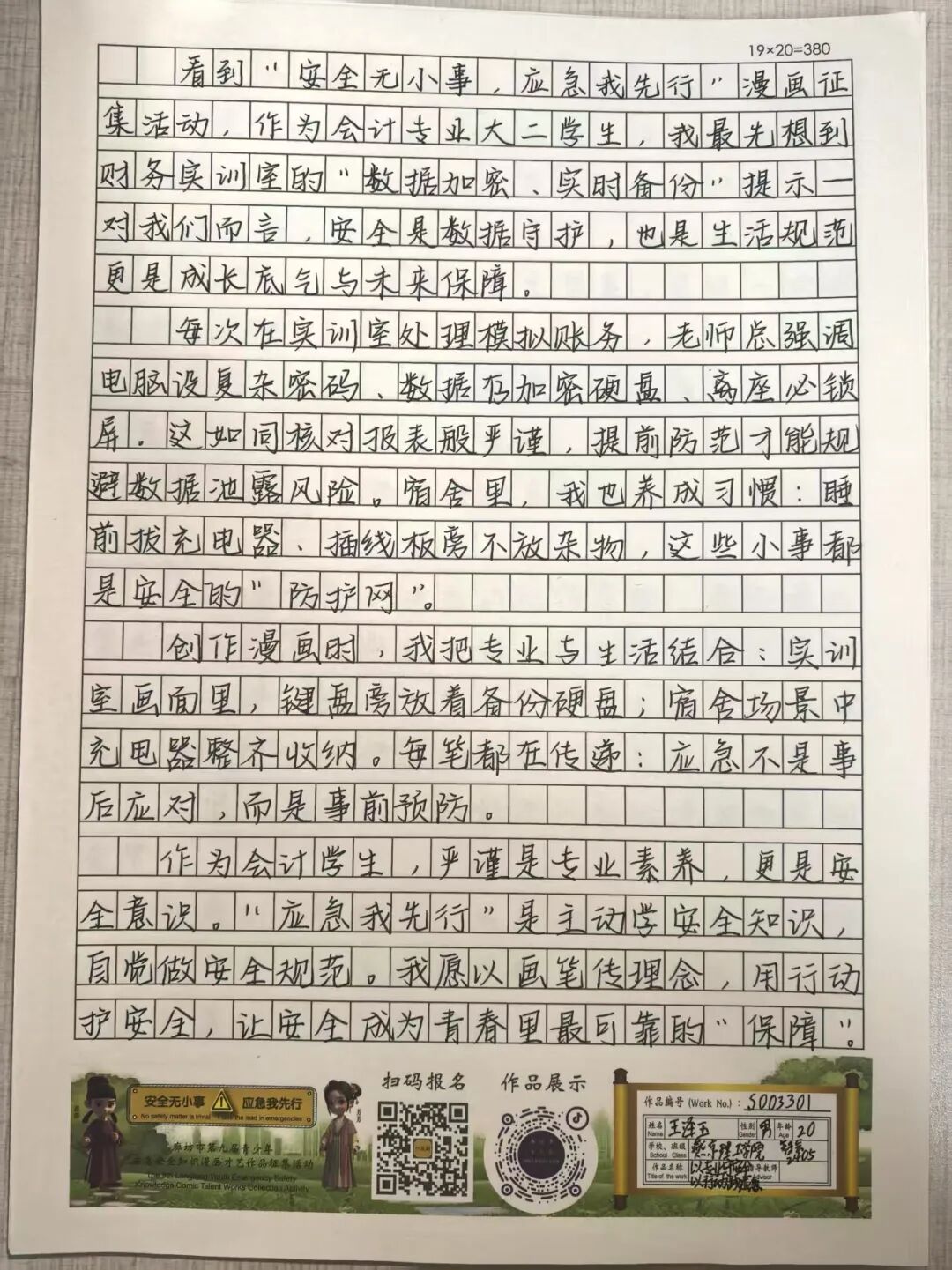“安全无小事,应急我先行”,这并非仅仅是一句口号,更是一种对生命负责的态度,一份守护安全的行动指引。为深入贯彻党的二十大和二十届三中全会精神,认真学习习近平总书记关于应急管理的重要论述和重要指示批示,会计学院团总支积极响应“廊坊市第九届青少年应急安全知识漫画才艺作品征集活动”的号召,现开展漫画才艺作品征集活动。 在应急安全知识的创意表达中,漫画以其生动的视觉语言成为独特载体。经过团总支对作品主题契合度、艺术表现力与传播感染力的综合考量,一批兼具教育意义与创作巧思的漫画佳作脱颖而出,它们将抽象的安全准则转化为鲜活的画面叙事,让应急避险的要点在笔尖流转中变得直观易懂,深入人心。 优秀作品展示:漫画 漫画以图像勾勒安全轮廓,书法则用笔墨传递安全信念。参赛青少年从笔锋提按转折到章法疏密布局,以横竖撇捺为媒介,将应急安全警示与守护温度融入汉字,让刚劲或秀逸的字迹注解安全理念。下面,让我们一同走进这些墨韵飘香的书法作品世界。 优秀作品展示:书法 欣赏过以图像勾勒安全轮廓的漫画,品鉴过借笔墨传递安全信念的书法,文字的力量同样不可忽视。在作文里,创作者以笔为桥梁,编织应急安全故事,有的讲述避险经历,使读者感同身受;有的阐释安全理念,传递守护温情。接下来,让我们一同走进这些以文字筑牢安全防线的作文,聆听关于安全的话语。 优秀作品展示:作文 会计学院团总支的应急安全知识作品征集活动已顺利完成。此次活动有效打破了应急安全知识“专业壁垒”,以“普及应急技能,筑牢安全防线”为核心,让原本抽象的火灾逃生、触电急救、地震避险等知识变得直观易懂。不仅激发了同学们主动学习安全知识的热情,更促使大家将所学转化为实际行动,在校园内营造出“人人讲安全、事事为安全”的良好氛围,切实提升了全体学生的应急安全素养与自我保护能力。 文/会计学院团总支 审核/数会2506 武嘉昕