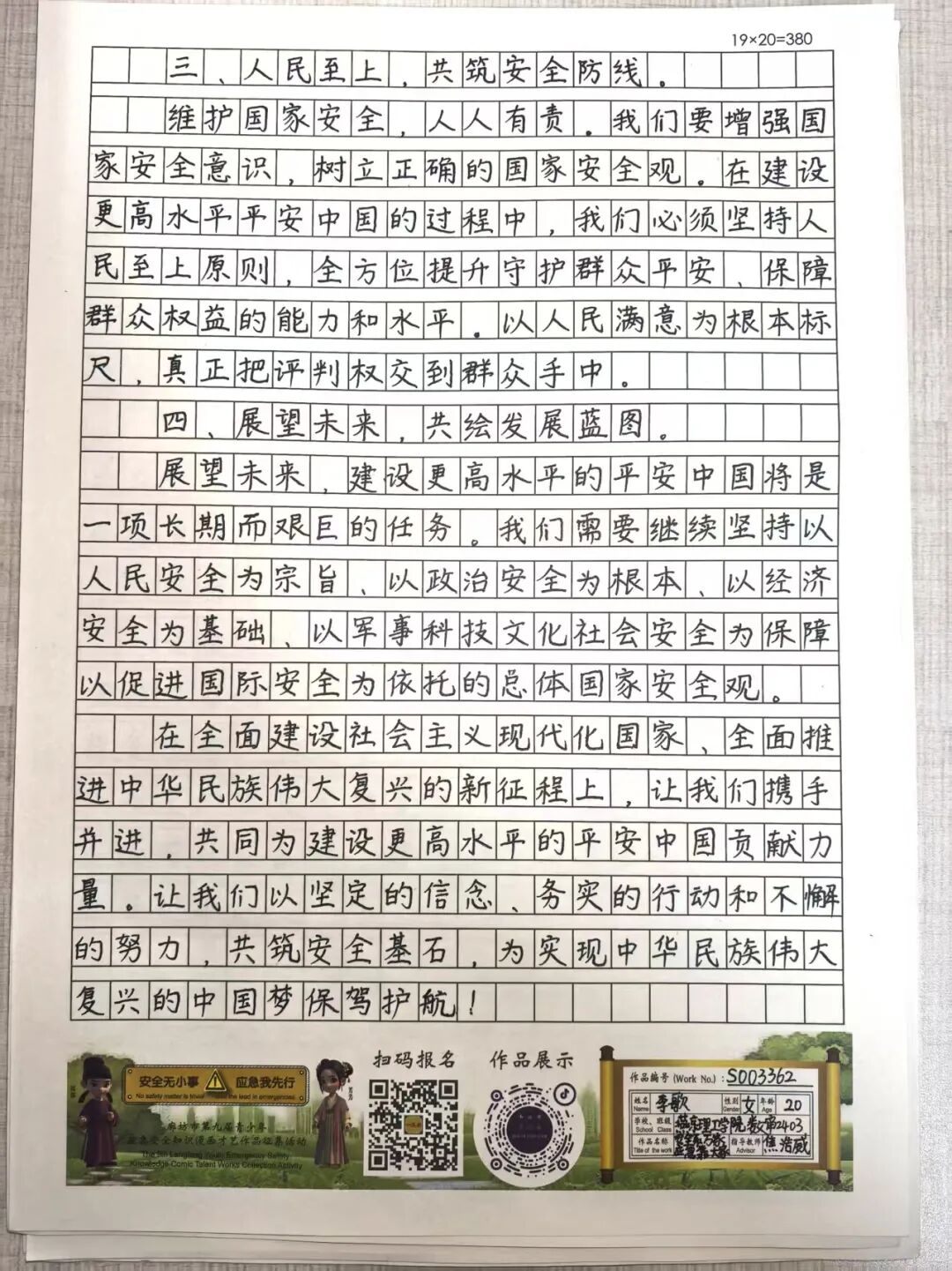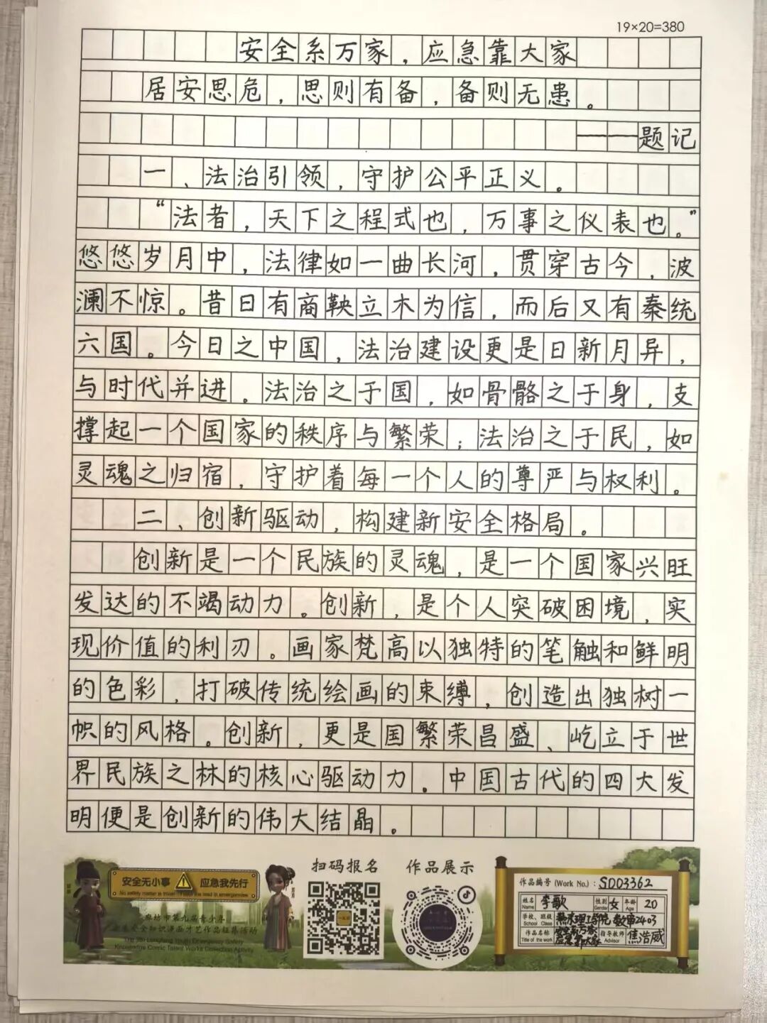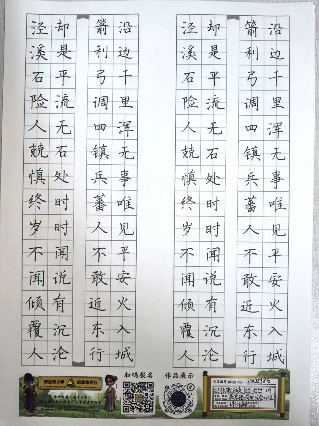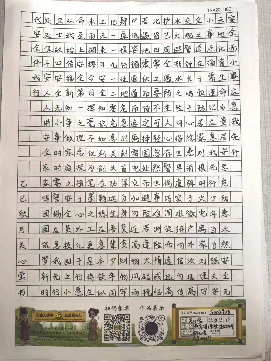 “安全无小事,应急我先行”,这并非仅仅是一句口号,更是一种对生命负责的态度,一份守护安全的行动指引。为深入贯彻党的二十大和二十届三中全会精神,认真学习习近平总书记关于应急管理的重要论述和重要指示批示,会计学院团总支积极响应“廊坊市第九届青少年应急安全知识漫画才艺作品征集活动”的号召,现开展漫画才艺作品征集活动。 在应急安全知识的创意表达中,漫画以其生动的视觉语言成为独特载体。经过团总支对作品主题契合度、艺术表现力与传播感染力的综合考量,一批兼具教育意义与创作巧思的漫画佳作脱颖而出,它们将抽象的安全准则转化为鲜活的画面叙事,让应急避险的要点在笔尖流转中变得直观易懂,深入人心。 优秀作品展示:漫画 漫画以图像勾勒安全轮廓,书法则用笔墨传递安全信念。参赛青少年从笔锋提按转折到章法疏密布局,以横竖撇捺为媒介,将应急安全警示与守护温度融入汉字,让刚劲或秀逸的字迹注解安全理念。下面,让我们一同走进这些墨韵飘香的书法作品世界。 优秀作品展示:书法 欣赏过以图像勾勒安全轮廓的漫画,品鉴过借笔墨传递安全信念的书法,文字的力量同样不可忽视。在作文里,创作者以笔为桥梁,编织应急安全故事,有的讲述避险经历,使读者感同身受;有的阐释安全理念,传递守护温情。接下来,让我们一同走进这些以文字筑牢安全防线的作文,聆听关于安全的话语。 优秀作品展示:作文 会计学院团总支的应急安全知识作品征集活动已顺利完成。此次活动有效打破了应急安全知识“专业壁垒”,以“普及应急技能,筑牢安全防线”为核心,让原本抽象的火灾逃生、触电急救、地震避险等知识变得直观易懂。不仅激发了同学们主动学习安全知识的热情,更促使大家将所学转化为实际行动,在校园内营造出“人人讲安全、事事为安全”的良好氛围,切实提升了全体学生的应急安全素养与自我保护能力。 文/会计学院团总支 审核/数会2506 武嘉昕