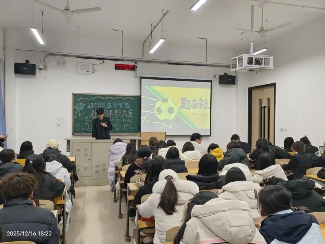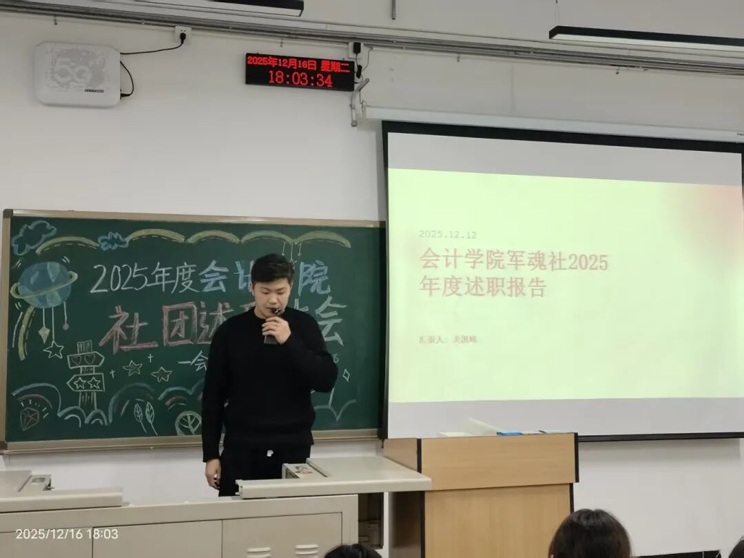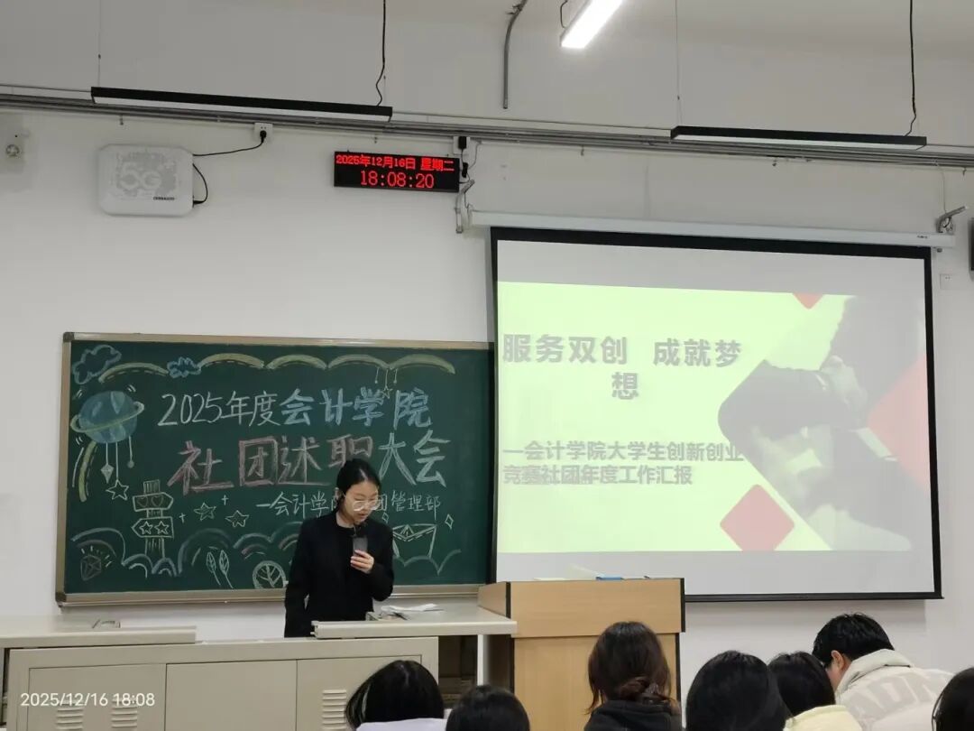 述职凝共识 聚力启新程 时光荏苒,步履不停。12月16日下午6点,会计学院各学生社团于D207教室开展述职大会。此次大会既是对过往社团工作的深度复盘,也是各社团交流经验、展望未来的关键契机,每一份述职报告都凝聚着社团成员的汗水与智慧,记录着成长的足迹。大会现场,各社团代表依次登台述职,展现出各具特色的工作成果与蓬勃朝气。 活动现场 军魂社代表率先发言,分享了社团持续优化活动策划方案、明确成员职责、强化沟通协作以保障活动顺利开展的经验,字里行间尽显热血与担当。 活动现场 大学生创新创业竞赛社团代表随后汇报,该社团成果突出,不仅举办多场创业培训讲座促进团队资源共享与思想碰撞,更有效激发了同学们的创新思维和创业热情,让实干精神落地生根。 活动现场 学创社代表的发言展现了社团的活力与思考,社团积极投身学创杯比赛,多名同学从校赛晋级省赛,为赛事输送了优秀人才,让学创的无限可能得以彰显。 活动现场 礼仪队代表则讲述了社团活跃于各类校内大型活动的经历,成员们以优雅的姿态和专业的服务保障活动顺利进行,在传播礼仪文化的道路上稳步前行。 活动现场 足球社代表分享了社团开展技巧训练、体能提升与战术研讨等活动的点滴,不仅提升了社员的足球水平,更增进了团队协作的默契,尽显足球运动的激情。 活动现场 辩论社代表的发言满是思辨的火花,社团本学期开展多场辩论赛事,吸引不同年级、专业同学参与,既为大家提供了锻炼口才的机会,也丰富了校园文化生活。 活动现场 商用社代表介绍了社团举办多场优质学习竞赛和研讨会的举措,为成员在专业领域的探索指引方向,浓郁的学术氛围吸引众多同学踊跃参与。 活动现场 HD舞社代表的讲述让现场感受到蓬勃的朝气与青春气息,社团用精彩的艺术展示为校园增添了活力。 活动现场 篮球社代表汇报了社团的发展历程,通过组织干部培训和工作会议,交流管理经验、研讨问题解决方案,展现了赛场内外的拼搏与成长。 活动现场 蒲公英志愿服务中心代表的发言传递出温暖与力量,社团在寒冬发起手工织围巾活动,将织好的围巾与明信片捐赠给偏远地区小学,用行动助力留守儿童。 活动现场 财经企业管理协会代表展示了社团定期召开会员大会、倾听成员建议的工作模式,尽显专业领域的社团风采。 活动现场 青航美妆工作室代表则分享了在美妆教学、形象设计方面的用心探索,让大家看到了社团在特色领域的深耕细作。 活动现场 述职环节结束后,大会对各社团过往工作予以肯定,并对未来发展提出期许。展望新征程,会计学院社团将积极拓展与其他社团、校外组织的合作维度,汇聚各方资源实现优势互补,打造更具号召力的品牌活动;用心做好社团文化的传承与创新,让社团精神在新老成员的接力中熠熠生,吸引更多同学融入社团活动,领略校园社团的别样风采。此次述职大会的举办,为会计学院社团发展找准了方向,也为各社团携手共创发展新篇章奠定了坚实基础。 活动现场 文/会计学院社团管理部 审核/注会2505 陈芊彤