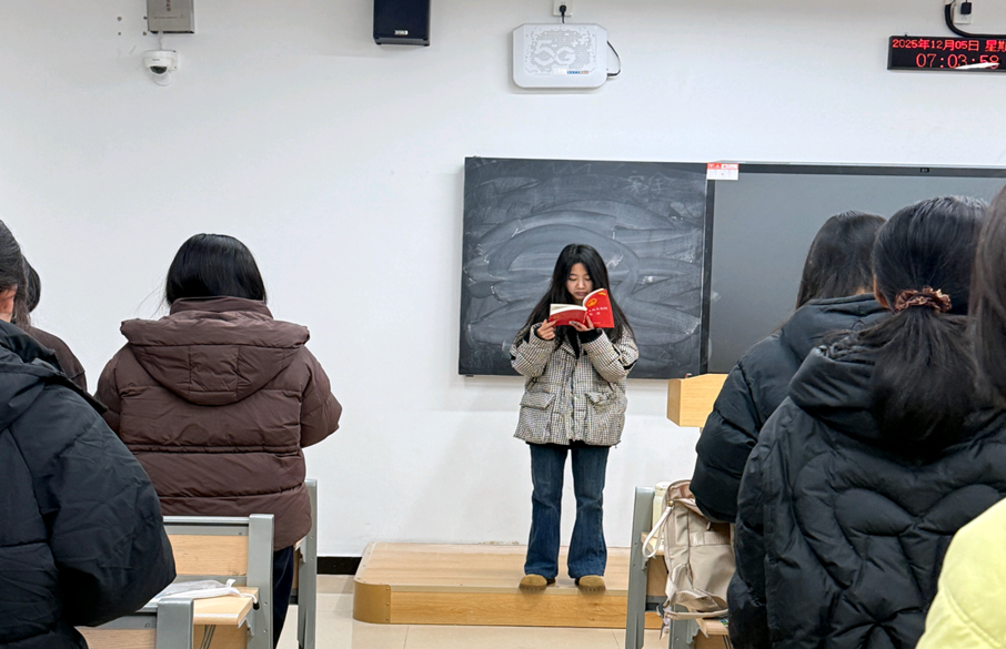 晨光启卷铸信仰,法典铿锵励青春。为推动宪法教育入脑入心,厚植新时代法治精神,培育青年学子的法治素养与社会责任感,助力法治校园建设提质增效,我院精心策划“晨读宪法”主题活动。学子们在晨曦中集体诵读宪法核心条款,让法治理念浸润成长之路,让宪法精神融入青春血脉。 活动现场 2025年12月12日,大一学子齐聚教室参与晨读宪法活动。同学们精神饱满、整齐列队,现场气氛庄严而专注。在领读人的引领下,全体同学齐声诵读宪法核心条款,清亮的读书声在校园里久久回荡,每一个字句都铿锵有力,既体现了对宪法尊严的尊崇,也展现了践行法治精神的坚定信念。诵读过程中,大家逐句揣摩条文深意,深刻认识宪法作为国家根本大法的重要意义,明确自身的权利与责任,真切体会宪法与个人成长、社会进步、国家安定的紧密关联,让法治思想在沉浸式的诵读中扎根心底。 活动现场 本次宪法晨读活动,借助清晨宁静专注的氛围,不仅有效提升了同学们的学习效率,帮助大家快速掌握宪法核心内容,更在潜移默化中深化了对宪法精神的理解,强化了法治意识与社会责任感。参与人员普遍反映,这次晨读是一次深刻的法治精神浸润,不仅让大家对宪法的权威性有了更直观的认识,也激发了主动学习和践行法治的内在动力。未来,大家将继续以宪法为根本遵循,把法治信仰融入成长轨迹,在日常学习和生活中自觉践行宪法要求,展现青年一代的责任担当,让宪法精神真正成为青春路上的精神底色和行动指南。 活动现场 文/会计学院团总支 审核/数会2506 武嘉昕