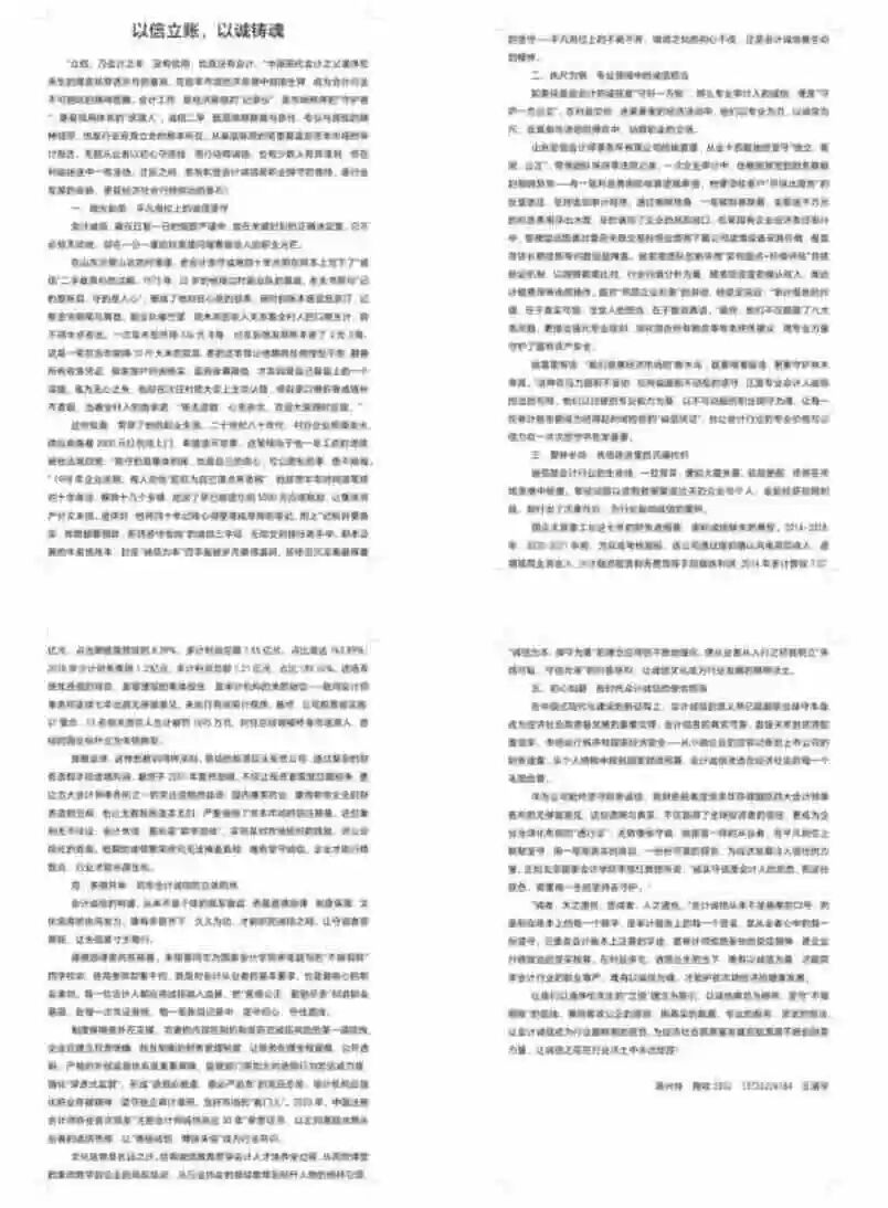 为厚植会计专业学子诚信素养,筑牢职业初心根基,近日,燕京理工学院会计学院团总支以“诚信铸魂 笔绘初心”为主题,精心策划并举办诚信征文大赛,吸引全院各年级学生踊跃参与,以笔墨传诚信,以文字践初心。 本次征文大赛紧扣会计行业核心准则,聚焦“诚信”主题,鼓励学子结合专业学习感悟、未来职业规划及生活实践,用文字诠释对诚信的理解与坚守。活动自启动以来,得到全院学生积极响应,大家踊跃投稿、用心创作。参赛稿件中,既有对会计行业诚信案例的深度剖析,也有对个人践行诚信理念的真实记录,字里行间饱含着学子们对诚信品质的敬畏之心,以及坚守职业底线的坚定决心。 依据公平公正原则,经学院团总支围绕“主题契合度、内容思想性、语言表达力、格式规范性”四大维度,对参赛作品进行层层筛选、严格评审,最终评选出若干优秀作品及获奖选手。获奖作品兼具思想深度与文字质感,充分展现了会计学院学子扎实的文字功底与鲜明的诚信价值观。 获奖作品展示 诚信征文获奖名单 一等奖: 税收2302 高兴佳--《以信立账,以诚铸魂》 二等奖: 注会2406云苹博--《课本旁的“较真劲”》 注会2504宋梦涵--《以诚信之笔,绘就会计人生的底色》 三等奖: 管会2502刘芸汐--《账册存初心 诚信铸匠心》 注会2508韩诗瑜--《街角的诚信秤:一位修鞋匠的诚信微光》 注会2503张佳宁--《诚信为基:成长路上的品格试金石》 优秀奖: 税收2503刘欣彤--《以诚信铸魂,育会计英才》 法会2402刘洋--《诚信如磐,行稳致远》 注会2301马岩岩--《诚信铸品格,品格定未来》 智会2403马雨杰--《成长路上的试金石:论诚信品格的塑造与长远发展》 为获奖人员颁发证书 此次诚信征文大赛,不仅为学子搭建了展现自我的文化平台,更以文育人、以文化人,进一步强化了学生的诚信意识与职业责任感。下一步,会计学院团总支将持续以多元活动为载体,深耕诚信教育,引导学子将诚信品质内化于心、外化于行,为培养高素质会计专业人才奠定坚实基础。 文/会计学院团总支 审核/会金2502 牛佳禾