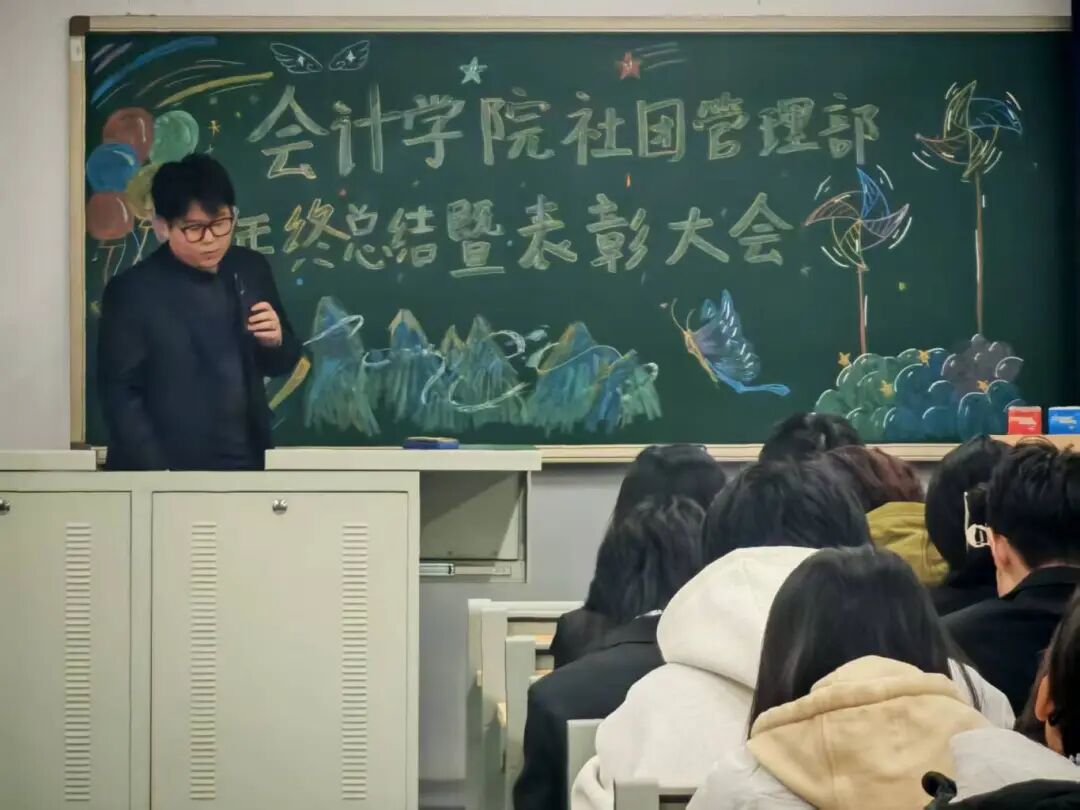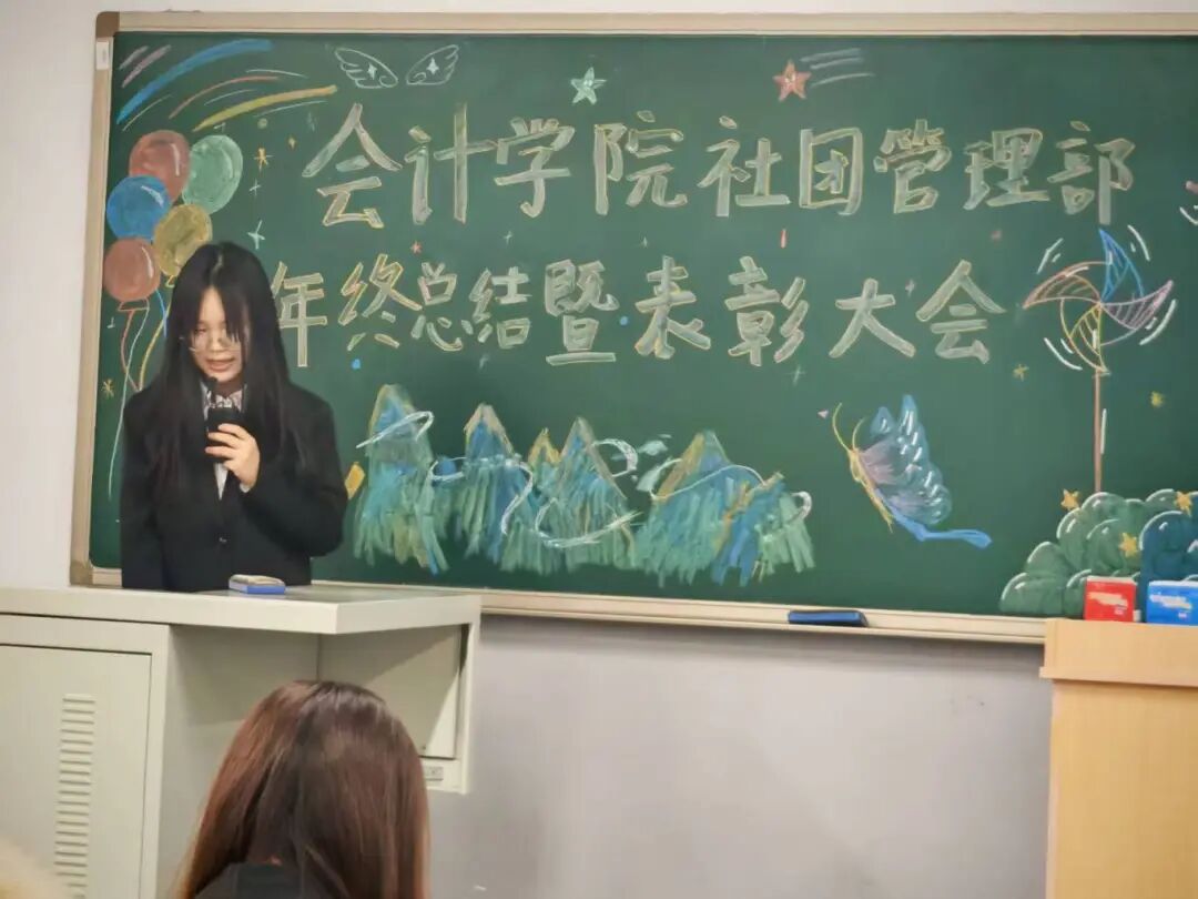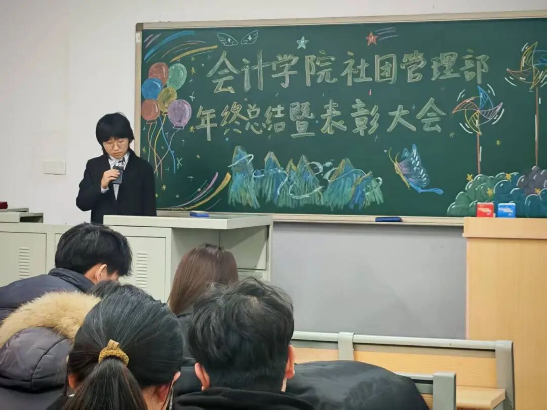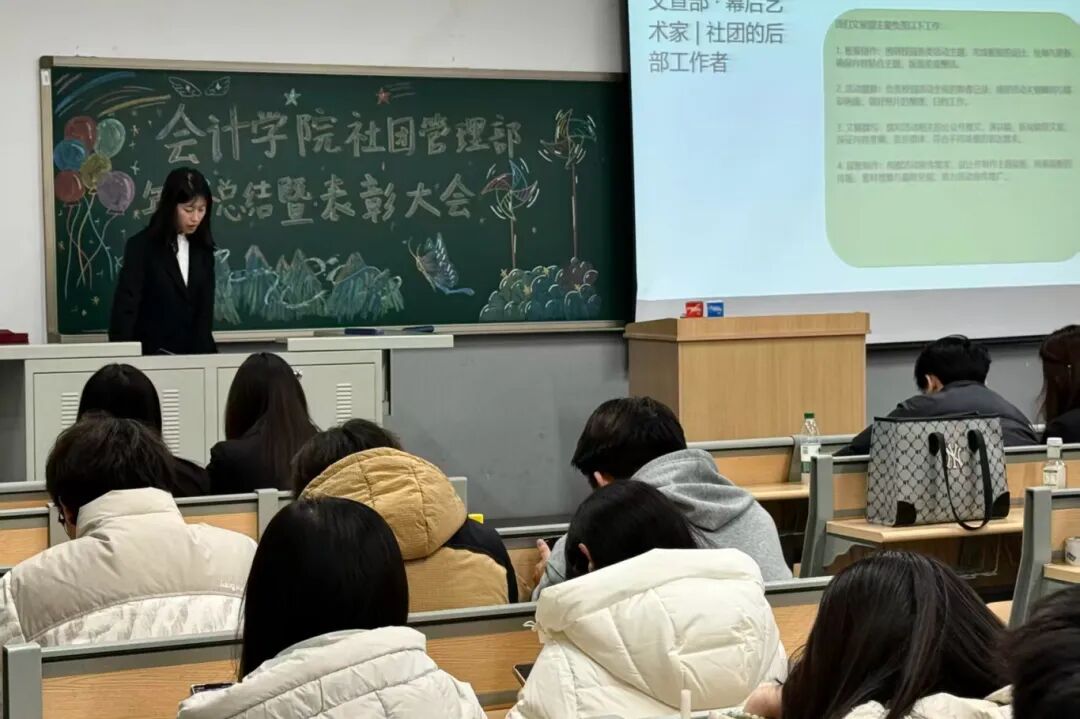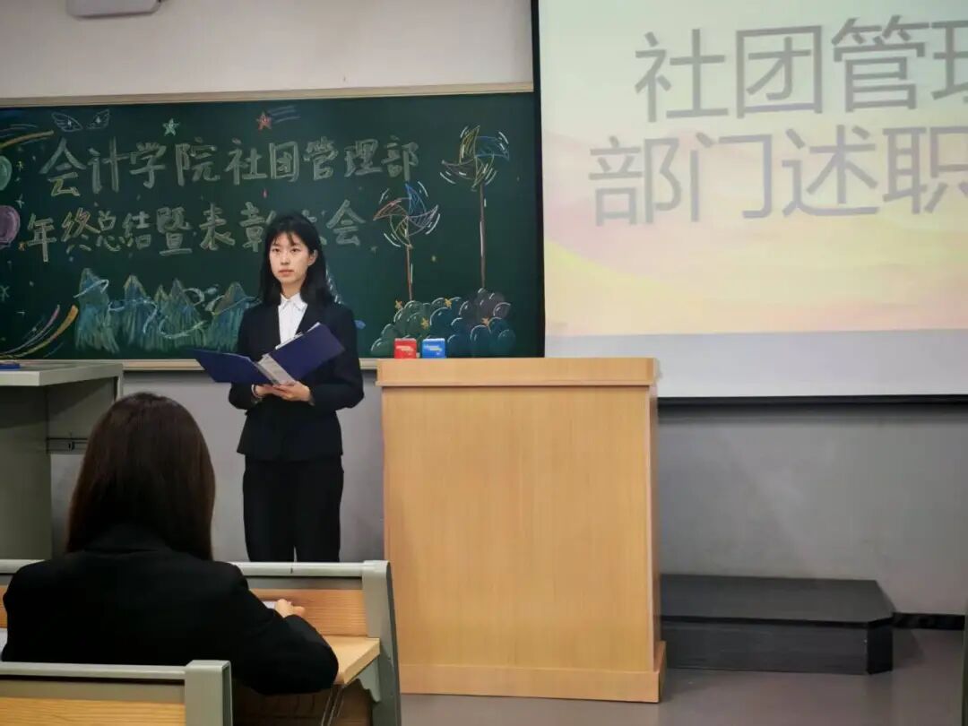 述职亮绩谋新篇 凝心聚力启新程 时光镌刻奋斗足迹,实干书写年度答卷。2025年12月23日晚上七点,会计学院社团管理部于C405教室开展年终总结暨表彰大会。学院指导老师及学生骨干齐聚一堂,共话成长、共商发展。本次大会总结了阶段性工作成果,反思工作中的不足,明晰下一阶段奋斗方向,并为优秀部长、部门及干事颁发了荣誉。这场兼具工作总结与青春交流的盛会,也将为社团管理部的新征程写下序章。 主持人开场发言简述述职流程 大会开始,指导老师刘嘉睿对本年度工作成果进行总结,梳理工作历程中的经验与不足,提出反思与学习方向。对各部门进行寄语,强调要以卓越的表现、创新的精神和强烈的责任感推进后续工作,为社团管理部的发展指明了路径。 指导老师发言并总结工作 随后主席团代表李茗钰进行年终总结,充分肯定各部门的工作完成情况,同时针对现存不足提出改进建议,并对未来发展规划做出指导,为部门工作的优化升级筑牢根基。 主席总结并明确未来工作方向 紧接着是各部门部长对该阶段工作进行述职。各部门部长结合学校校园文化建设要求,规划会计学院社团的整体发展方向。有序举办了各种活动,如社团述职大会、换届、校园海棠文化节等相关活动,指导学院社团活动的策划与开展,如社团嘉年华等,积极把控活动流程、安全与质量。监督各社团的日常运营,核查社团活动审批材料、经费使用情况,规范社团行为,对违规社团提出整改意见并跟进落实。加强对部门干事的选拔、提升干事的业务能力与责任意识。关注干事的成长与发展,为部门储备后备干部,打造高效协作、积极向上的团队氛围。 部长述职 强化部门职能 紧接着各部门干事代表对各自部门的工作进行了汇报。在本学期的工作中,各部门始终秉持着“服务社团、规范管理、助力校园文化建设”的宗旨,积极完成各项工作安排,认真履行职责,恪尽职守,扎实完成各项工作任务。协助落实学校社团管理的各项规章制度以及运行。 干事述职 展示部门风采 最后是激动人心的表彰环节,各部长,部门,干事以耐心与责任获得表彰。他们从前期筹备到后期收尾,部门里的每一个环节都有人认真把控,这份对工作负责、对集体负责的态度都得到成员们的肯定。一张张荣誉证书,既是对过往付出的肯定,更是对未来前行的激励。 优秀部长 部门 干事获奖合照 此次述职暨表彰大会,不仅全面展示了社团管理部的工作成果、深刻反思了现存问题,更明晰了未来发展方向。道阻且长,行则将至;行而不辍,未来可期。过往的成绩是全体成员共同奋斗的勋章,未来的挑战更需携手并肩。会计学院社团管理部将以青春之名,赴实干之约,在新征程中坚守初心,继续书写属于社团管理的崭新篇章。 合影留念 记录美好时光 文/会计学院社团管理部 审核/注会2505 陈芊彤