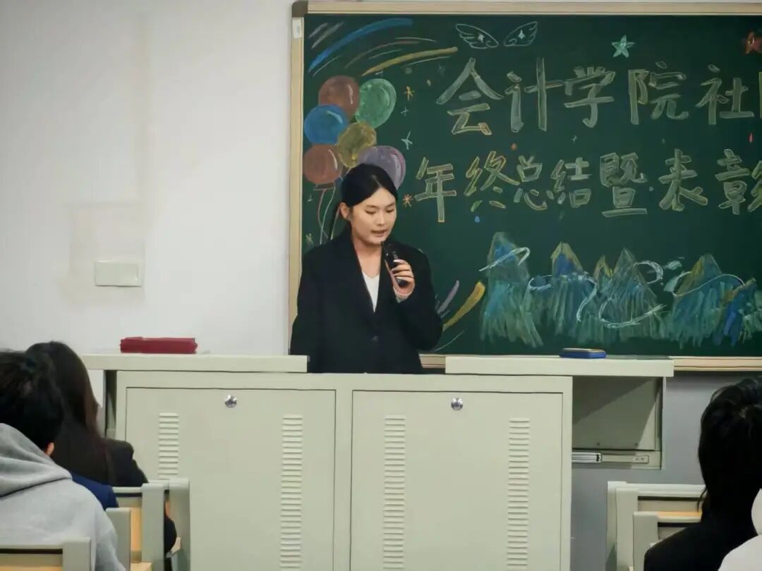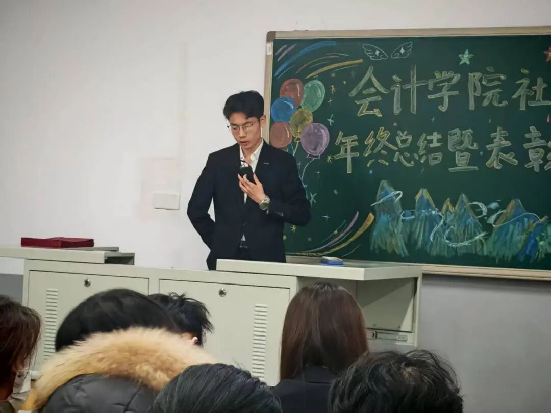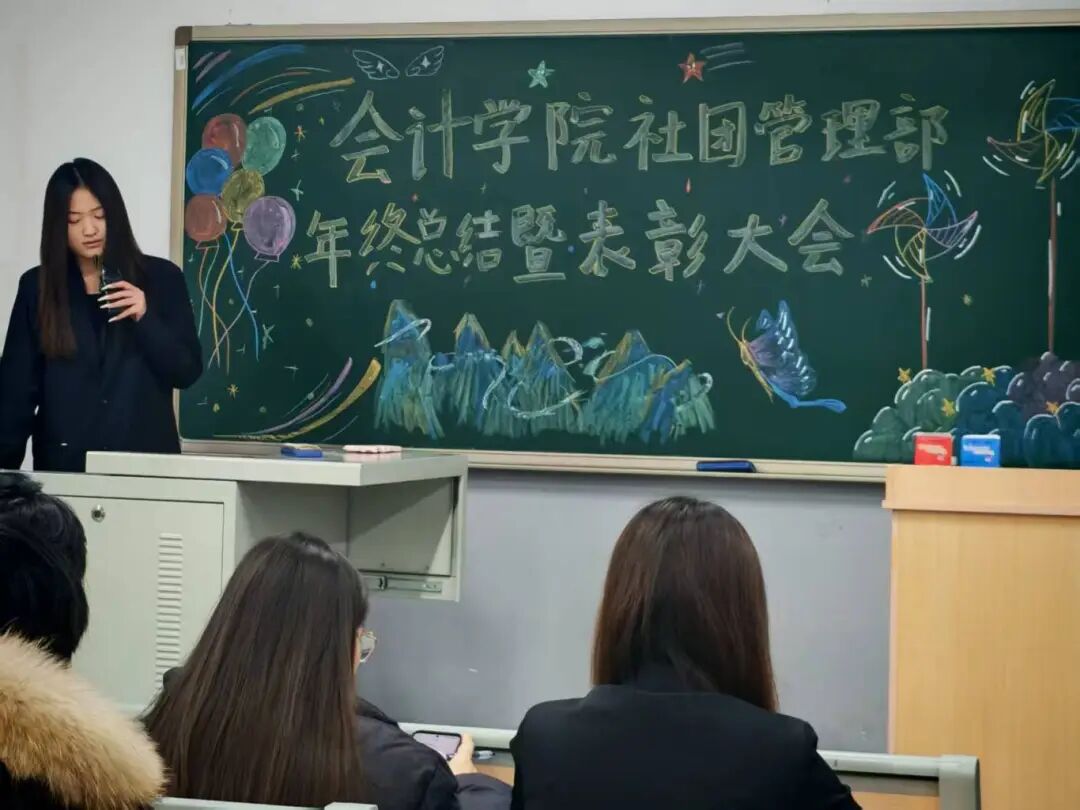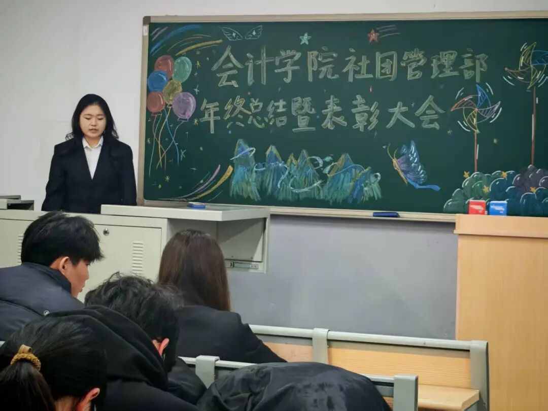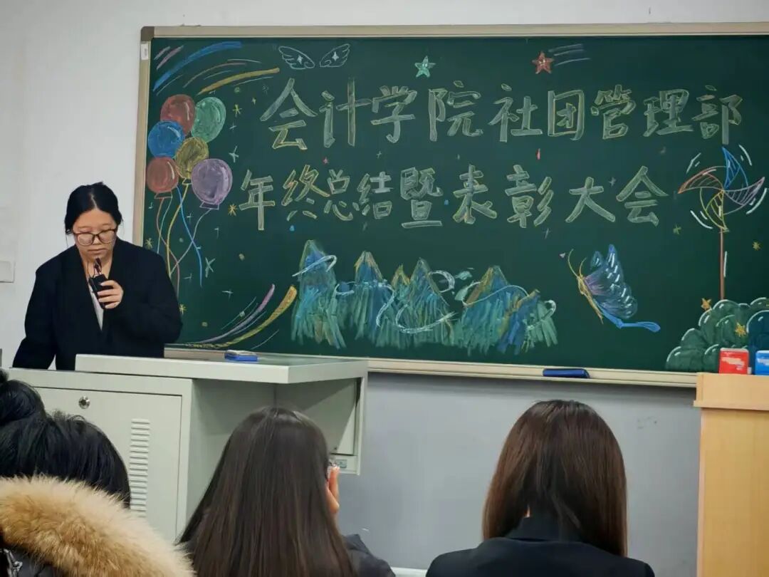 述职亮绩谋新篇 凝心聚力启新程 时光镌刻奋斗足迹,实干书写年度答卷。2025年12月23日晚上七点,会计学院社团管理部于C405教室开展年终总结暨表彰大会。学院指导老师及学生骨干齐聚一堂,共话成长、共商发展。本次大会总结了阶段性工作成果,反思工作中的不足,明晰下一阶段奋斗方向,并为优秀部长、部门及干事颁发了荣誉。这场兼具工作总结与青春交流的盛会,也将为社团管理部的新征程写下序章。 主持人开场发言简述述职流程 大会开始,指导老师刘嘉睿对本年度工作成果进行总结,梳理工作历程中的经验与不足,提出反思与学习方向。对各部门进行寄语,强调要以卓越的表现、创新的精神和强烈的责任感推进后续工作,为社团管理部的发展指明了路径。 指导老师发言并总结工作 随后主席团代表李茗钰进行年终总结,充分肯定各部门的工作完成情况,同时针对现存不足提出改进建议,并对未来发展规划做出指导,为部门工作的优化升级筑牢根基。 主席总结并明确未来工作方向 紧接着是各部门部长对该阶段工作进行述职。各部门部长结合学校校园文化建设要求,规划会计学院社团的整体发展方向。有序举办了各种活动,如社团述职大会、换届、校园海棠文化节等相关活动,指导学院社团活动的策划与开展,如社团嘉年华等,积极把控活动流程、安全与质量。监督各社团的日常运营,核查社团活动审批材料、经费使用情况,规范社团行为,对违规社团提出整改意见并跟进落实。加强对部门干事的选拔、提升干事的业务能力与责任意识。关注干事的成长与发展,为部门储备后备干部,打造高效协作、积极向上的团队氛围。 部长述职 强化部门职能 紧接着各部门干事代表对各自部门的工作进行了汇报。在本学期的工作中,各部门始终秉持着“服务社团、规范管理、助力校园文化建设”的宗旨,积极完成各项工作安排,认真履行职责,恪尽职守,扎实完成各项工作任务。协助落实学校社团管理的各项规章制度以及运行。 干事述职 展示部门风采 最后是激动人心的表彰环节,各部长,部门,干事以耐心与责任获得表彰。他们从前期筹备到后期收尾,部门里的每一个环节都有人认真把控,这份对工作负责、对集体负责的态度都得到成员们的肯定。一张张荣誉证书,既是对过往付出的肯定,更是对未来前行的激励。 优秀部长 部门 干事获奖合照 此次述职暨表彰大会,不仅全面展示了社团管理部的工作成果、深刻反思了现存问题,更明晰了未来发展方向。道阻且长,行则将至;行而不辍,未来可期。过往的成绩是全体成员共同奋斗的勋章,未来的挑战更需携手并肩。会计学院社团管理部将以青春之名,赴实干之约,在新征程中坚守初心,继续书写属于社团管理的崭新篇章。 合影留念 记录美好时光 文/会计学院社团管理部 审核/注会2505 陈芊彤