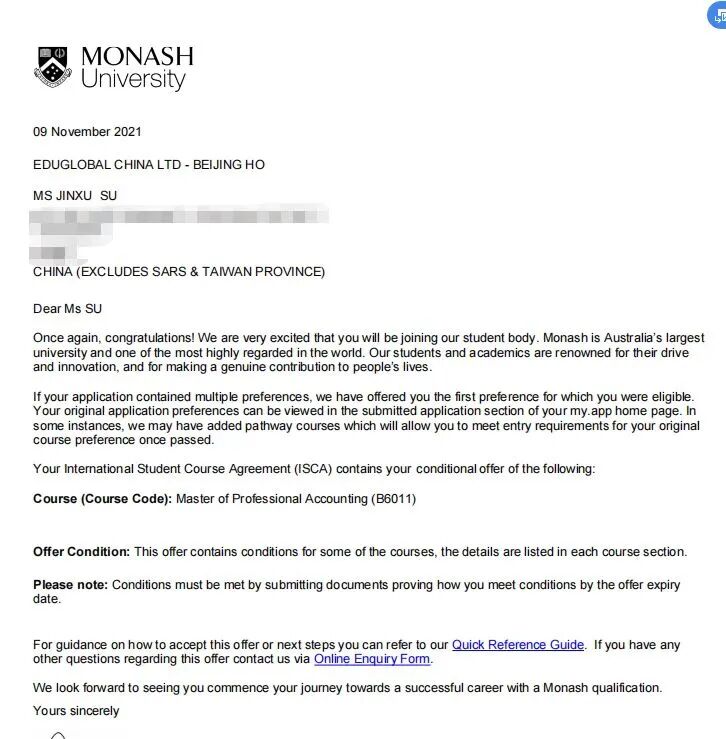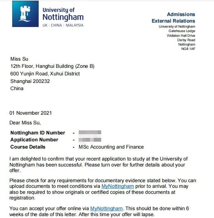 往者不谏,来者可追 会计学院注会1806班苏金旭同学陆续获得了莫纳什大学(2022QS世界排名58)的专业会计硕士offer,诺丁汉大学(2022QS世界排名103)、卡迪夫大学(2022QS世界排名151)、萨塞克斯大学(2021QS世界排名226)的会计与金融硕士offer。获得这些offer后,苏金旭发自内心地感慨终于不负自己当初的选择和努力。 前途未远,步履不停 进入大学,苏金旭和很多学生一样,对于未来的发展方向和道路感到迷茫,不知道自己的未来在哪,应该是何种定位;直到她发现了学校的海外深造项目,报名之前,她担心过这个项目会不会真的提供一对一的个性化指导,自己的学习能否跟上,但是真正报名之后发现,国际教育学院的彭雪雪老师和其他老师都会不厌其烦地解答所有问题。不管是申请择校方面亦或雅思学习方面,还是生活上遇到的一些问题,老师们都会很耐心的提供建议。 虽有疑虑,仍然坚持 在疫情最严重的时候,苏金旭也曾想过到底应不应该出国。她觉得这是一个好机会,可能错过以后就不能再出去学习深造了,而且她觉得自己一直在爸爸妈妈庇护下长大,所以她很希望借助海外学习的机会,培养自主学习意识和独立生活能力。最终她还是选择了出国留学这条路,做出了正确的选择。 拨云见日,梦想成真 国外的学校非常看重本科成绩,并且十分重视专业实习和证书。因此,在校内苏金旭利用课余时间不断提升自己,经常能在图书馆看到她学习专业课或者准备证书考试的身影;放假在校外她也积极寻找实习机会,不断进行背景提升。在雅思学习方面,她跟紧老师的步伐,努力准备雅思考试。由于她的听力和口语基础薄弱,听从老师的建议后,她不断强化输入,多听,多背,抓住课上机会多和老师练习,课下积累了许多素材。勤学如春起之苗,不见其增,日有所长。最终她的口语和听力都取得了明显进步。 诺丁汉大学offer 莫纳什大学offer 正是这种对于目标的坚守,才使得她的梦想照进现实,守得云开,拨云见日。也希望所有海外深造国际班的学生都能够不念过往,不惧将来,成为更好的自己,拥有闪亮的未来。 文/燕京理工学院国际教育学院 审核/会金2502 牛佳禾