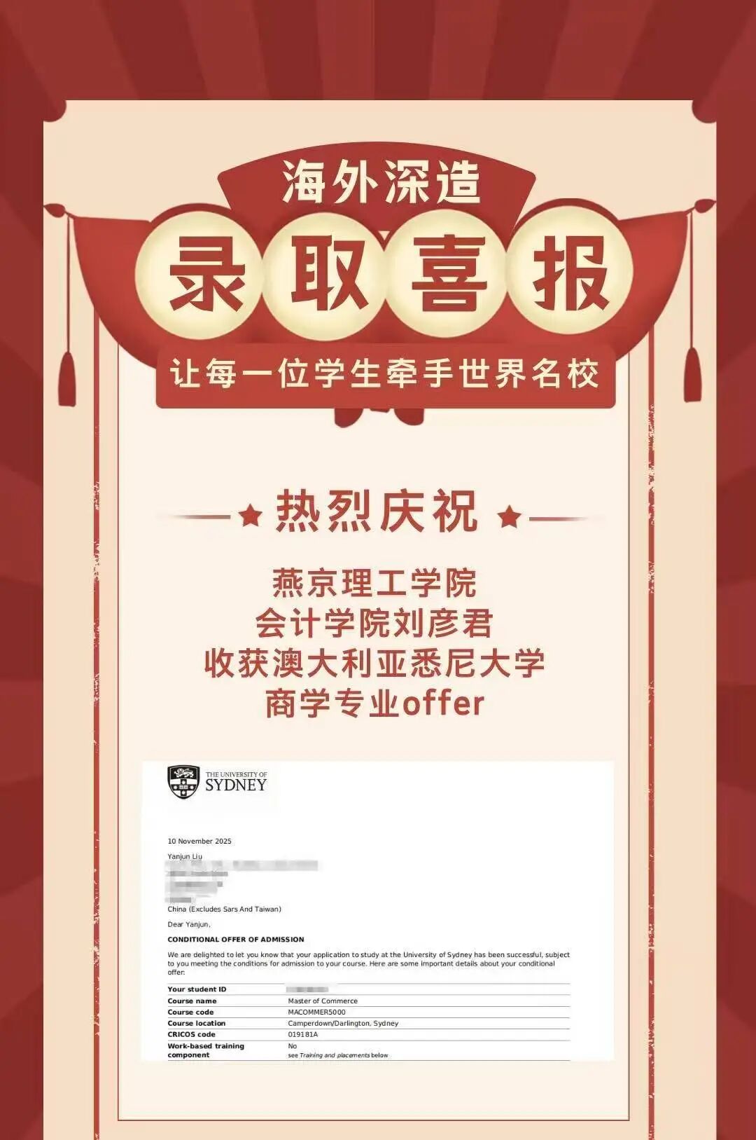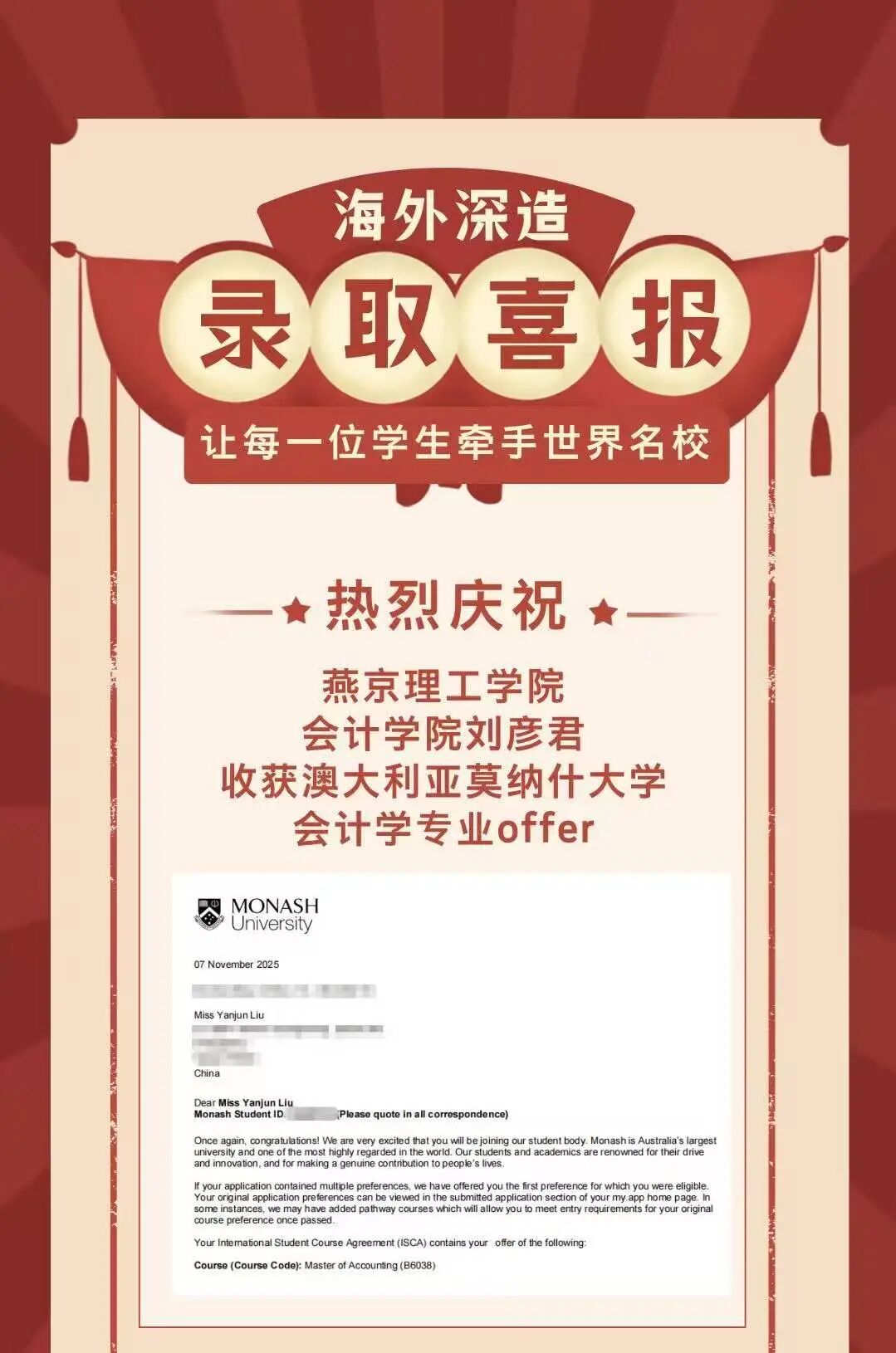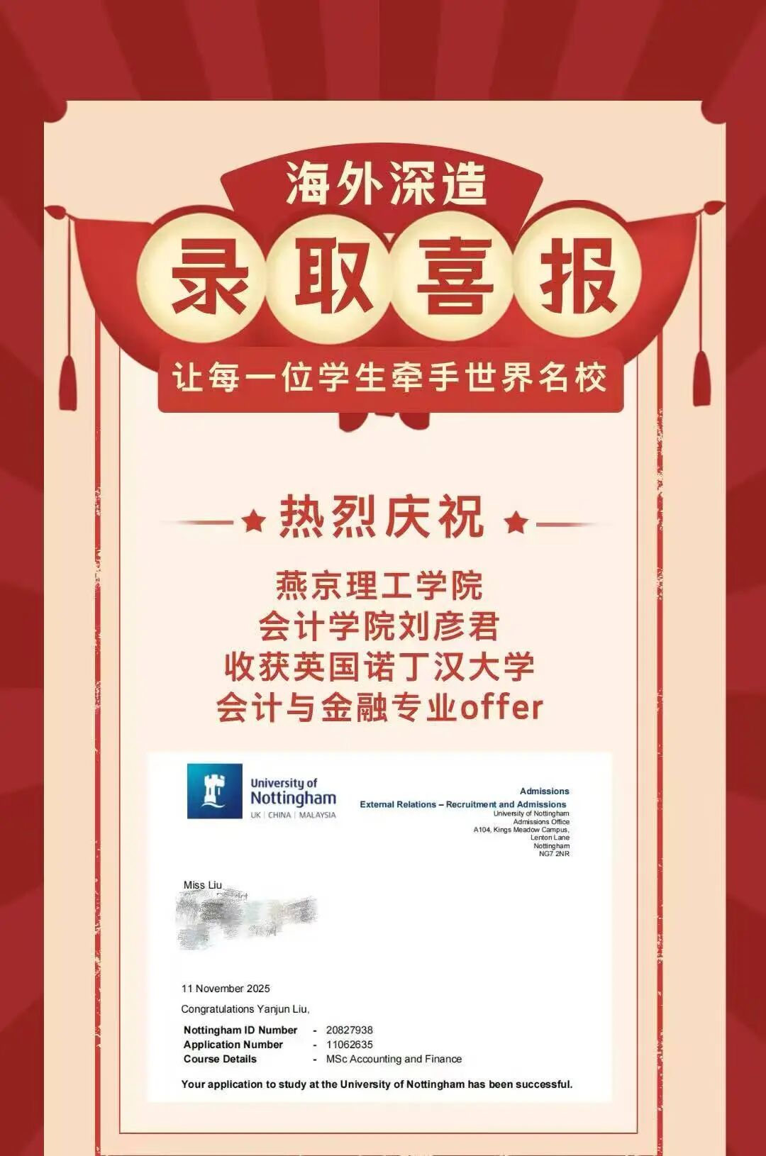 凝数智之慧 明会计准则 拓学识之境 启专业之光 愿君亲启,不负期许的OFFER! 会计学院贾钊 收获英国诺丁汉大学会计与金融专业、英国南安普顿大学会计与管理专业Offer 会计学院李沁蔓 收获澳大利亚悉尼大学商学专业、英国诺丁汉大学会计与金融专业Offer 会计学院刘彦君 收获澳大利亚悉尼大学商学专业、澳大利亚莫纳什大学会计学专业、英国诺丁汉大学会计与金融专业Offer 向顺利斩获海外名校Offer的会计学子们致以最诚挚的祝贺!这份荣誉不仅是你们日夜钻研专业、打磨能力的见证,更彰显了燕京理工学院会计学院国际化育人的坚实成效。逐梦路上,专业功底是底气,不懈坚持是阶梯,愿更多同学带着会计人的严谨与远见,奔赴世界名校,在国际舞台上续写专业华章! 文/注会2404 郭钰涵 审核/数会2511 田佳鑫