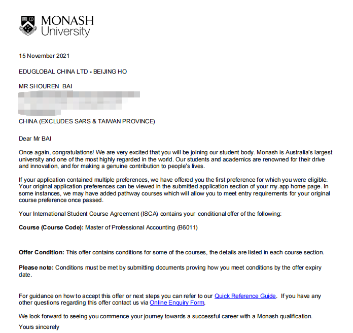 海外深造优秀学子柏首任 2022届会计学院会计专业柏首任同学获得昆士兰大学(2022年QS世界排名第47)金融专业offer,莫纳什大学(2022年QS世界排名第58)专业会计专业offer,和诺丁汉大学(2022年QS世界排名第103)、卡迪夫大学(2022年QS世界排名第151)、萨里大学(2022年QS世界排名第272)会计与金融专业offer。 诺宁汉大学offer 莫纳什大学offer 深思熟虑,做出抉择 柏首任同学在大一时就有出国留学的想法,他感觉研究生的起点相对更高。而对比出国读研,国内考研竞争更加激烈。出国留学虽然人数也多但相比国内考研来说情况要好很多,另外还有自己想开拓视野等方面因素,最后在参与了海外研学项目体验了国外的学习氛围后决定要出国留学。 消除疑虑,勇敢前行 在报名海外深造项目之前,柏首任同学也存在一些顾虑。首先是可申请院校的数量与质量的问题,但除了个别不接受双非院校的海外高校,大部分学校都能申请,另外还有一部分合作院校,排名也不算太低,可以作为自己的选择;其次是他对排课与学习环境的担心,毕竟还要学习专业课程,他担心自己不能很好的兼顾。但是通过专业分班来安排课程时间,单独准备教室与自习室的情况下,他发现对专业课程影响其实不大。 学长寄语 对于学弟学妹们,他语重心长地说:“如果条件允许的话,海外深造绝对是值得的。一方面可以提升自己,另一方面更能开拓国际视野与格局,对未来的隐性价值不比学习所收获的少,当然前提是要积极学习和融入当地的文化,不能只埋头学习,那就失去留学的一大意义了。” “无论是选择国内考研还是海外深造,希望学弟学妹们都能够坚定信念,勇敢前行,成就更好的自己!” 文/燕京理工学院国际教育学院 审核/数会2511 窦春晓