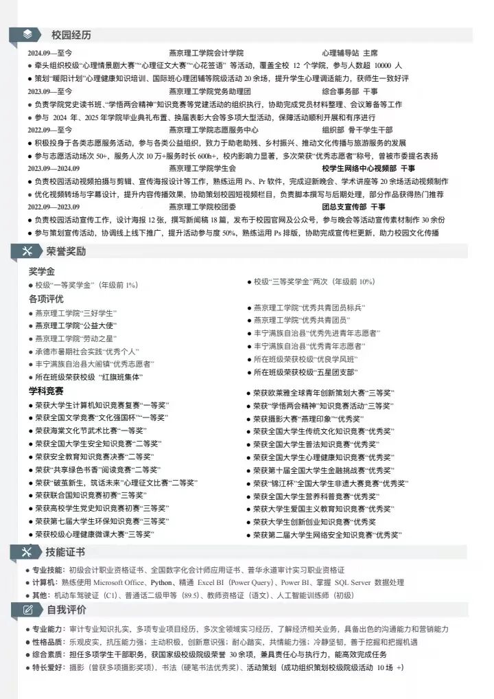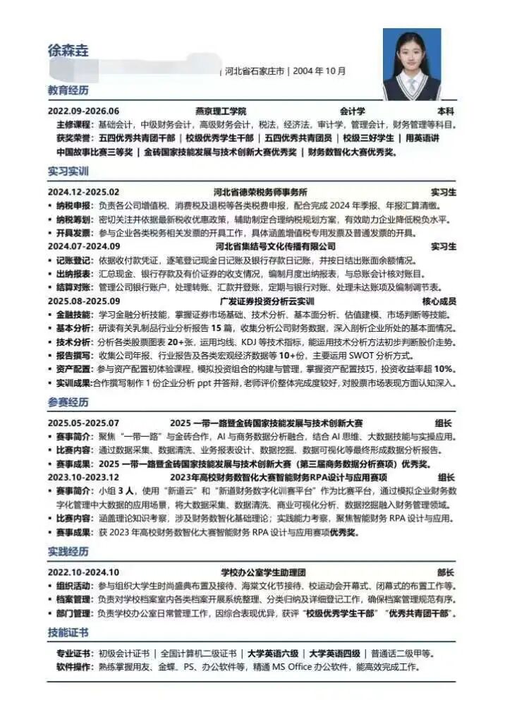 一份简历,是求职者为自己描绘的职业蓝图,也是迈向职场的首块试金石。为助力2026届毕业生锻造核心竞争力,我校简历风采大赛圆满落幕。大赛涌现出众多各具特色、彰显实力的优秀作品,其中数审2201 刘妍、注会2206 徐森垚的简历因精准匹配岗位需求、突出核心能力、呈现逻辑清晰,成功斩获一等奖。这些优秀范例现已集中展示,期待为同学们打磨个人简历、备战求职季提供有效启发。