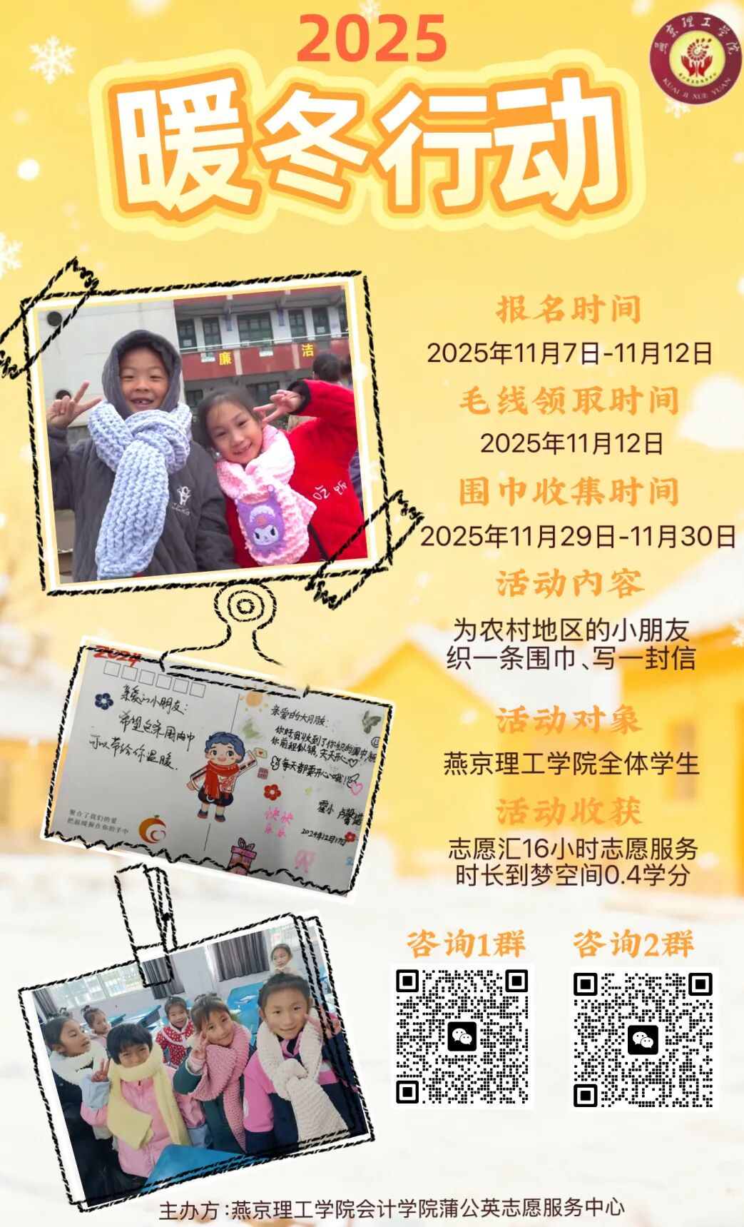 寒意渐浓,冬意悄临。当我们在校园裹紧外套,踏过梧桐叶落的校道时,远方大山里,有一群孩子正迎着凛冽山风跋涉求学。他们的小脸被寒风冻得通红,单薄的衣衫下,冬天比我们想象中更显漫长。 这个冬天,让我们用指尖温度驱散寒意。 燕京理工学院会计学院蒲公英志愿服务中心“织一条围巾,暖一颗童心暖冬行动”正式启动!一条围巾或许不足以改变世界,却能为孩子筑起抵御严寒的温暖防线,点亮他们整个冬日的希望。 无论你是巧思善织的手工达人,还是初次执针的新手小白,都欢迎加入这场爱心行动!这不仅是一次手作实践,更是一场爱的修行,每一针穿梭都承载牵挂,每一线缠绕都满含祝福。 活动详情 报名时间:2025年11月7日-11月12日 毛线领取时间:2025年11月12日 围巾收集时间:2025年11月29日-11月30日 参与方式:扫描下方二维码,加入“织围巾”公益活动群,获取更多活动指引。 这个冬天,让我们暂别屏幕,重拾针线,将满腔热忱织进绒线,把真挚关怀送往大山深处。你手作的温度,将成为孩子们抵御寒冬的勇气;你倾注的心意,将化作他们求学路上的暖阳。 以线为媒,以针传情,让我们携手编织一个温暖满溢的冬天! 文/会计学院蒲公英志愿服务中心 审核/税收2501刘萌
