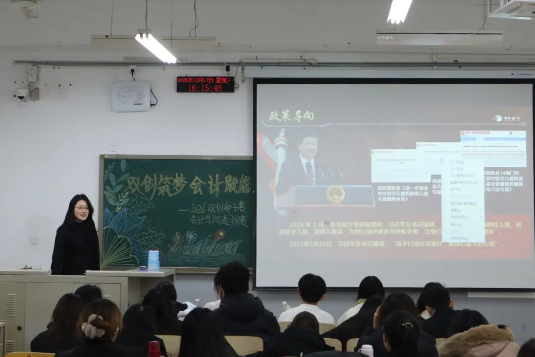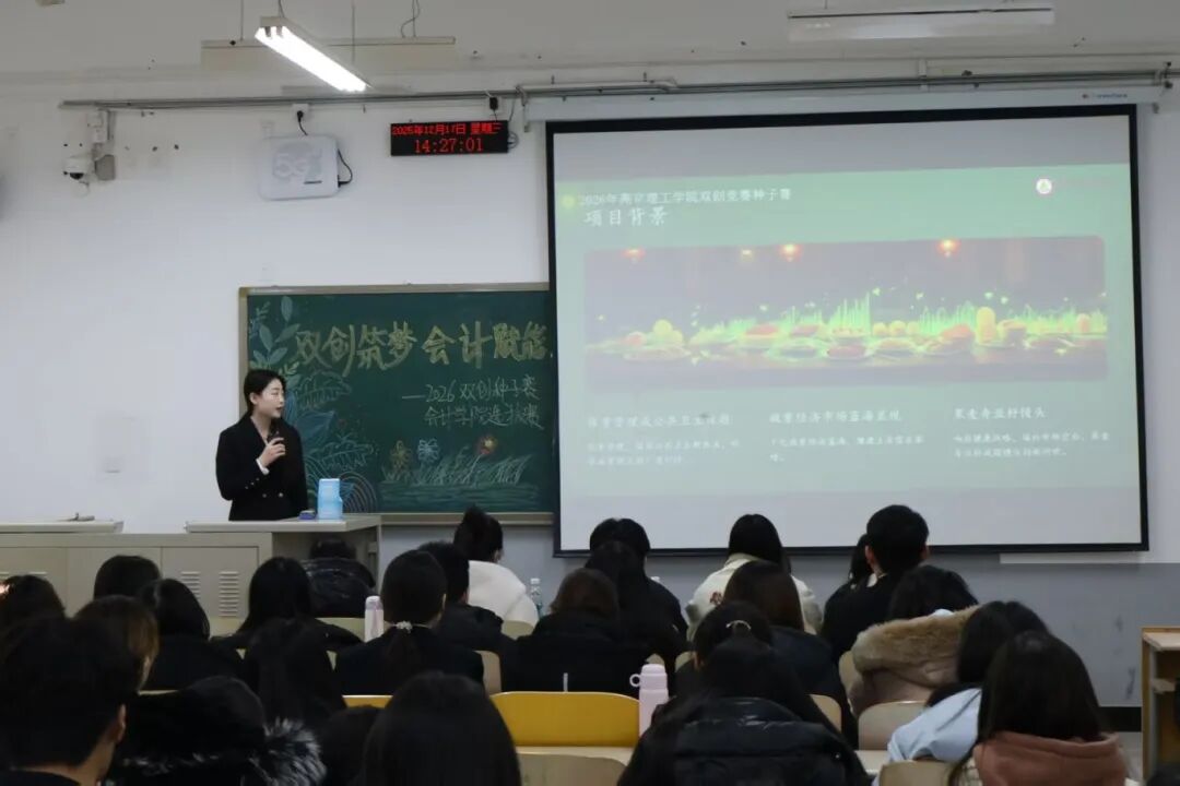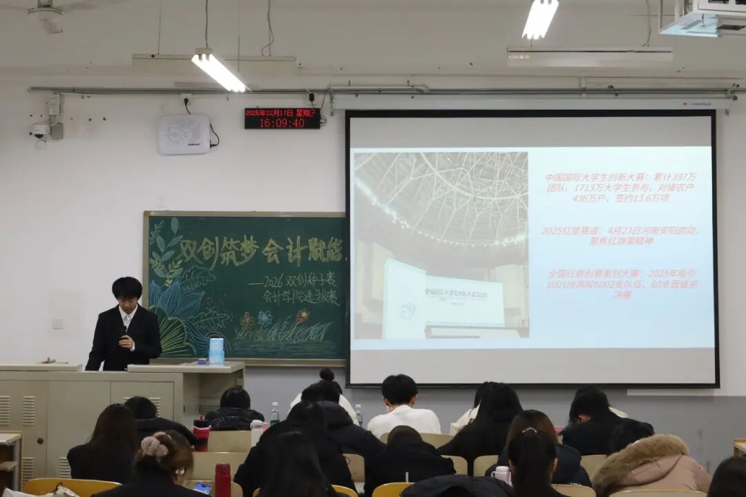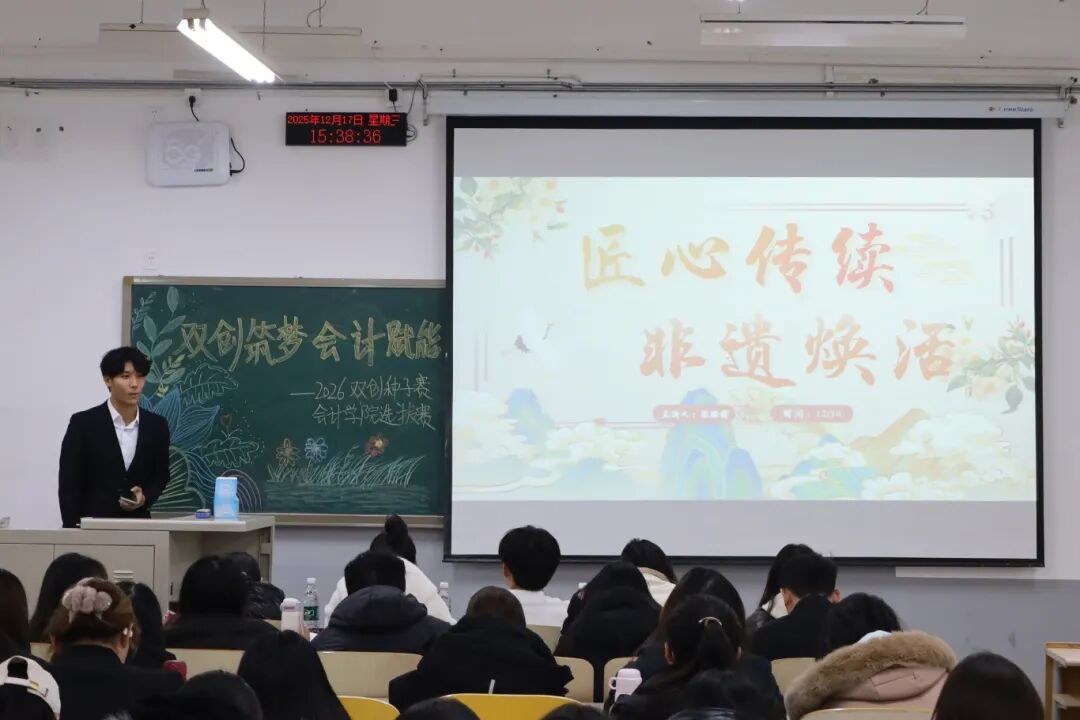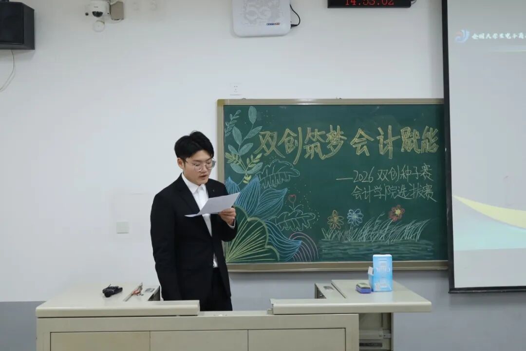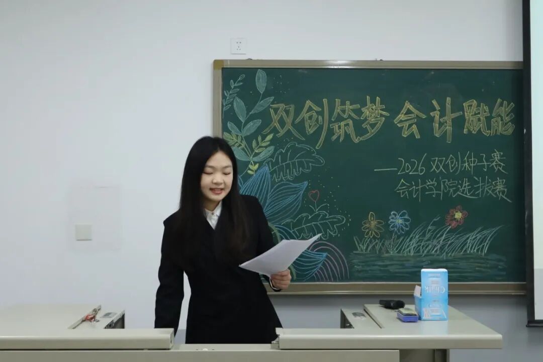 为践行“创新、协作、实用”的双创精神,进一步拓展学生创新能力和团队协作能力,激发青年学子的创新思维与创业活力,提升核心竞争力与时代担当,12月17日,2026双创种子赛会计学院选拔赛于教学楼M307举行。本次比赛由会计学院教师、辅导员代表担任评委,共有34支队伍参加。 活动现场 为践行“创新、协作、实用”的双创精神,进一步拓展学生创新能力和团队协作能力,激发青年学子的创新思维与创业活力,提升核心竞争力与时代担当,12月17日,2026双创种子赛会计学院选拔赛于教学楼M307举行。本次比赛由会计学院教师、辅导员代表担任评委,共有34支队伍参加。 活动现场 在点评环节中,评委们褒贬分明、精准施策。他们既肯定选手项目的创新亮点与团队的投入付出,又聚焦市场适配性、盈利模式、落地路径等核心问题,给出切实可行的优化建议。专业的指导不仅帮选手找准短项目汇报环节中,参赛团队负责人依次上台,通过PPT直观展示各自的创业成果。他们聚焦科技赋能、绿色发展、民生服务、文化交流等热门领域,结合扎实的专业知识与详实的市场调研数据,条理清晰地阐述项目的创意来源、核心商业模式、技术研发优势以及预期的社会价值,同时详细介绍了团队成员的协作分工、现阶段的推进成效和未来的阶段性执行规划。汇报过程中,评委针对项目的市场定位、盈利可持续性、落地难点等关键问题进行即兴提问,各团队沉着应对、应答流畅,充分展现出扎实的专业素养与良好的临场应变能力。选手们的精彩表现赢得了在场评委和观众的一致认可与阵阵掌声。此次双创种子赛初赛的成功举办,不仅为会计学院学子提供了一个展现创意、锤炼能力的广阔舞台,更是学校深化创新创业教育、落实人才培养目标的生动实践。它标志着会计学院在培育具备创新精神、创业能力和国际视野的新时代复合型人才道路上又取得了新的进展。相信未来,这些怀揣创业梦想的会计学子们,将为行业发展与社会进步注入源源不断的青年力量。 活动现场 文/注会2404 郭钰涵 数审2504 郭佳瑶 审核/管会2502 李欣晨