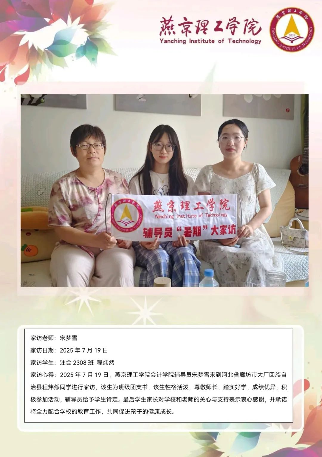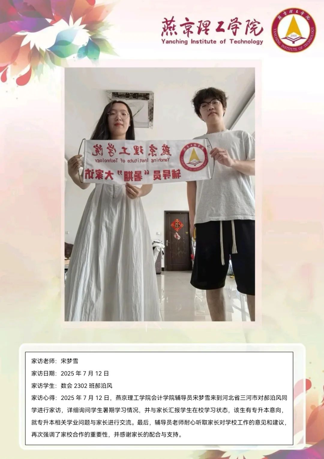 为深化家校协同育人机制,凝聚家校共育合力,精准掌握学生暑期阶段的学习动态与生活状态,会计学院组织老师进行暑期家访活动。老师们聚焦学生近期学习状况、未来职业规划方向以及奖助政策解读等内容,与学生及家长展开深度对话,共同助力学生发展。本次家访活动开启了家校协同赋能学生成长的新征程,为学生综合素质提升与长远发展筑牢根基。学校将持续坚守“家校共育,携手同行”理念,深化家校沟通桥梁,增进家长与教师的理解互信,实现家校教育同频共振,为学生奔赴美好未来铺就坚实道路。文/会计学院审核/注会2409 王婷
