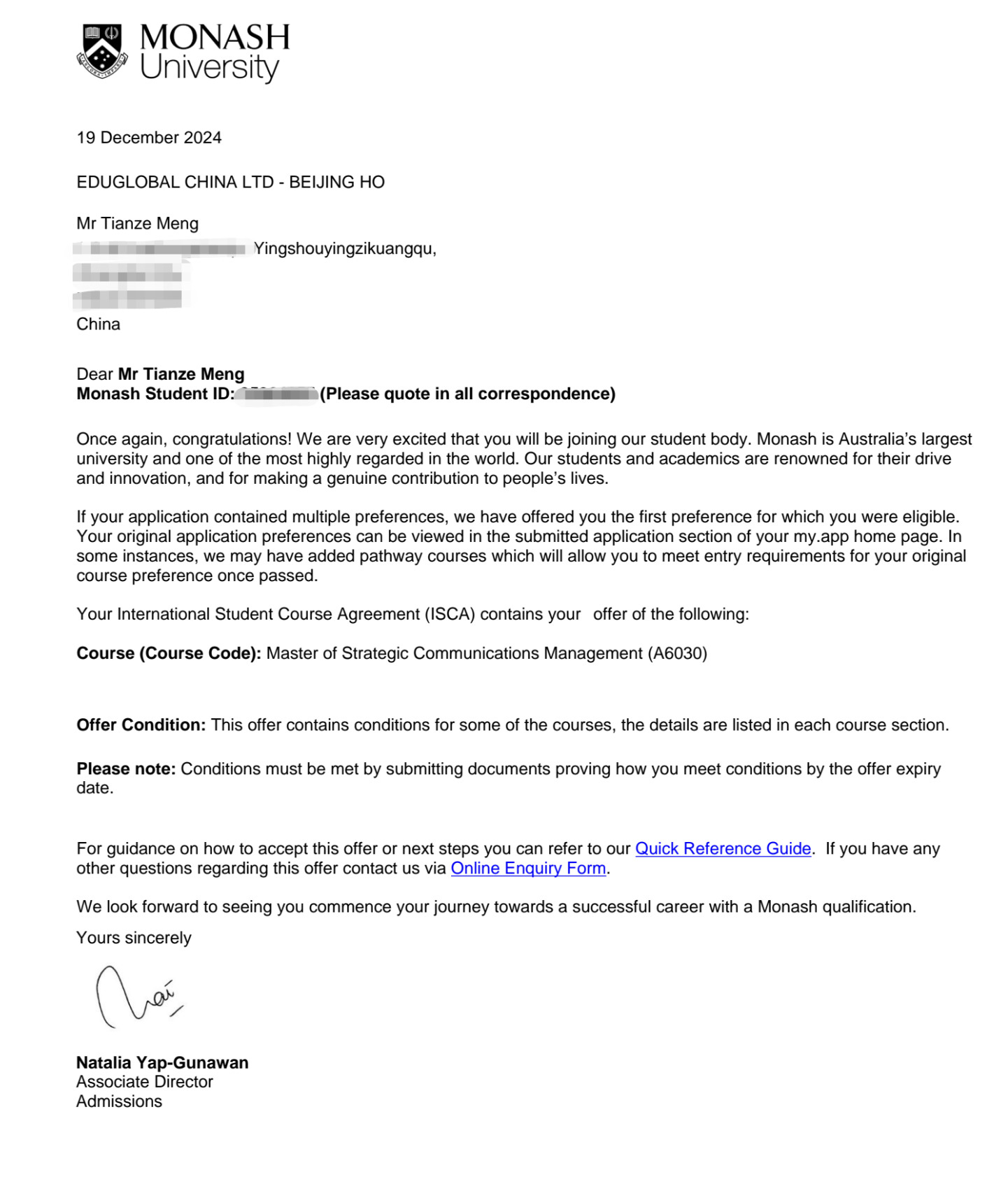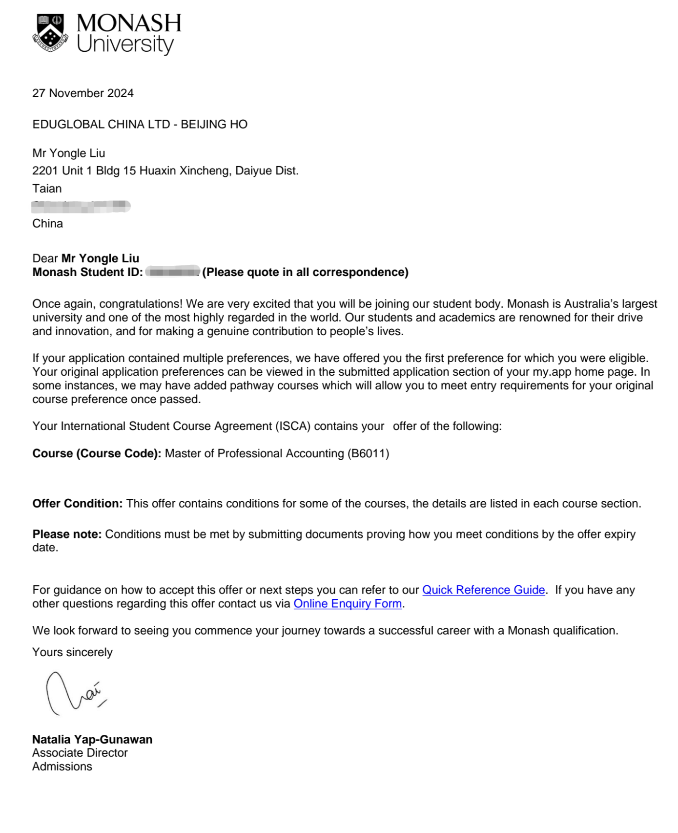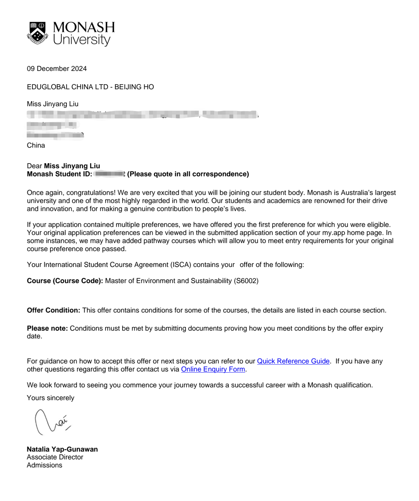 1刘金扬 刘金扬 刘金扬,环境与健康学院,现已收到新南威尔士大学、莫纳什大学、昆士兰大学、麦考瑞大学、悉尼科技大学Offer。 悉尼科技大学 麦考瑞大学 昆士兰大学 莫纳什大学 新南威尔士大学 2刘玮林 刘玮林 刘玮林,艺术学院,现已收到宁波诺丁汉大学Offer。 宁波诺丁汉大学 3刘永乐 刘永乐 刘永乐,传媒学院,现已收到悉尼大学、澳大利亚国立大学、莫纳什大学、昆士兰大学Offer。 悉尼大学 莫纳什大学 昆士兰大学 澳大利亚国立大学 4孟天泽 孟天泽 孟天泽,传媒学院,现已收到诺丁汉大学、埃克塞特大学、莫纳什大学、西澳大学Offer。 西澳大学 诺丁汉大学 莫纳什大学 莫纳什大学 向斩获海外名校录取通知书的各位同学表示祝贺,这不仅标志着同学们辛勤付出得到了认可,更是为学校的国际化育人增添了浓墨重彩的一笔。人生没有白走的路,每一步都算数,让我们共同期待更多学子展现自己的才华与潜力,成功牵手世界名校。 文/燕京理工学院国际教育学院 审核/注会2403 栗淼冉