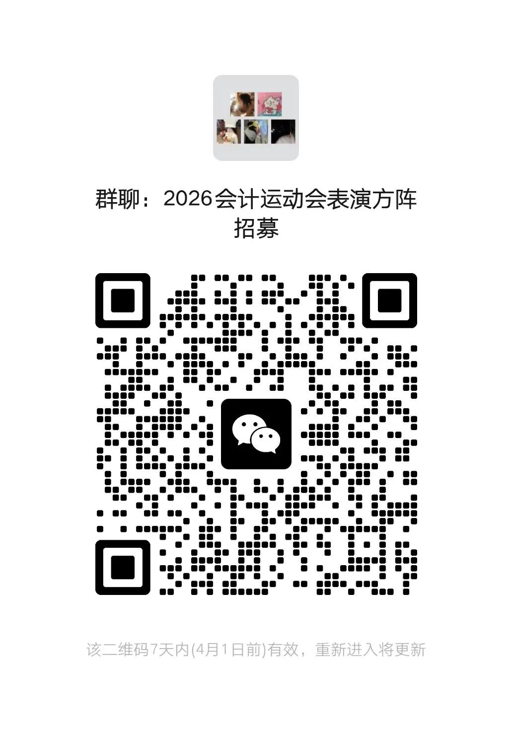 聚光灯已就位,方阵待你登场!在燕理的春日里,运动会的号角即将吹响,会计学院需要一群有活力、有热血的你,站在全校目光中央,用整齐的步伐、昂扬的姿态,为这场青春盛会炸响开场!为展现学院学子风采,凝聚集体力量,燕京理工学院会计学院运动会开场表演方阵现正式面向全院在读学子招募成员,邀你一起在舞台上绽放光芒,在协作中收获成长! 一、招募对象: 会计学院全体在读学生 二、招募时间: 截止到2026年4月3日 三、招募要求: 1. 有活力、爱集体、守纪律,能按时参加排练 2. 会舞蹈基础或有表演经验者优先 3. 有无基础均可,热情比经验更重要! 四、参与福利: 1.表现优异者授予“优秀个人”等称号 2.可获得德育分及梦空间第二课堂学分认定 3.定格青春合照,留下大学超燃回忆 五、演出地点: 燕京理工学院大操场 六、演出时间: 待定 青春不设限,舞台任你闯!无论你是有舞蹈功底的表演达人,还是初次尝试的校园新人,这里都将是你释放激情、展示自我的绝佳平台。在这里,你将与同频的伙伴并肩前行,在排练中收获友谊,在演出中成就高光,用行动为学院添彩,用热爱为青春注脚! 期待每一位心怀热忱、敢于展现的你加入,让我们一起以方阵为笔,以表演为墨,在运动会的舞台上书写属于会计学院的精彩篇章,成为全场最耀眼的焦点! 报名方式:扫描下方二维码加入表演方阵专属微信群。 文/会计学院学生会 审/注会2511 王婧萌